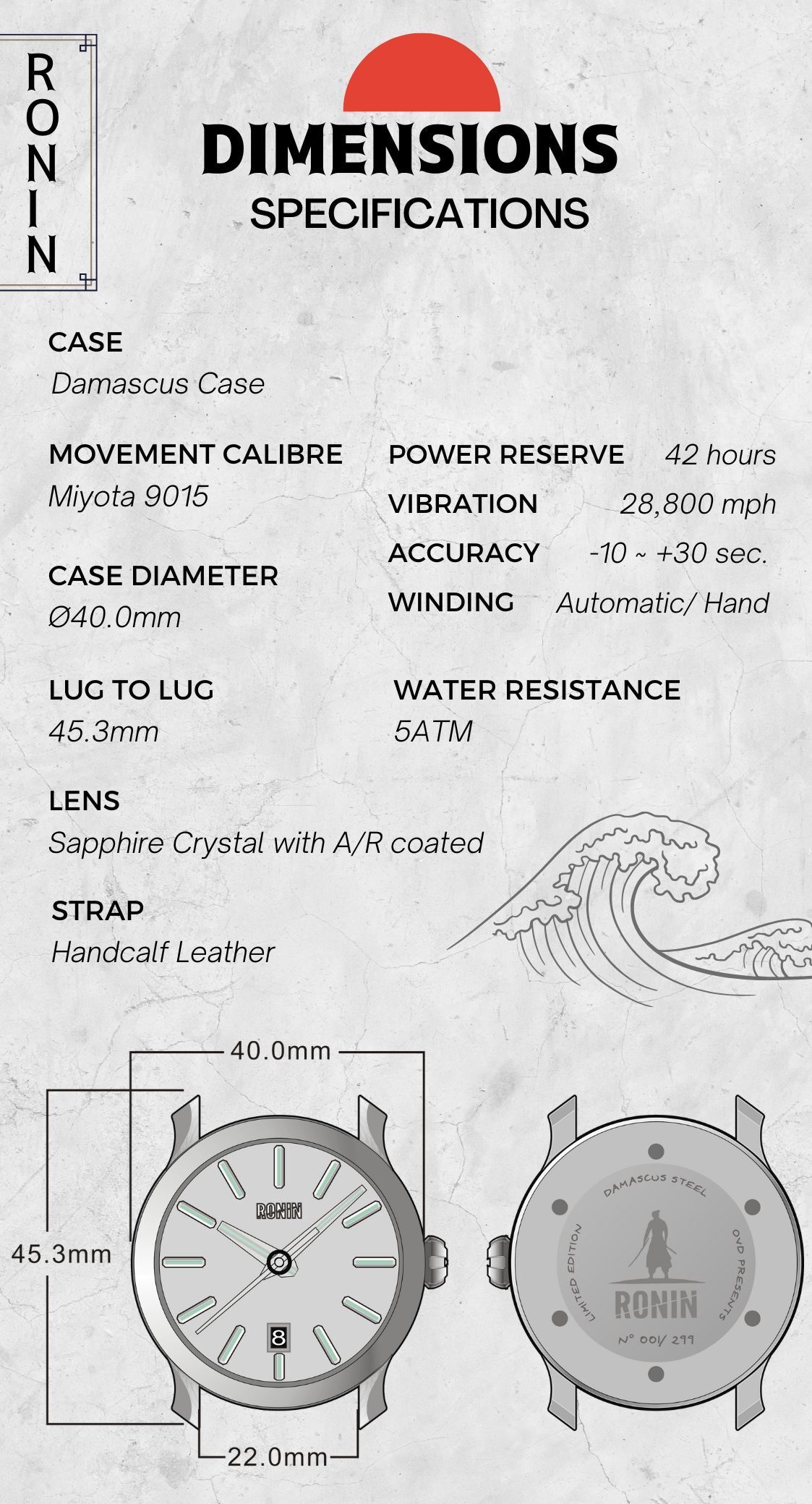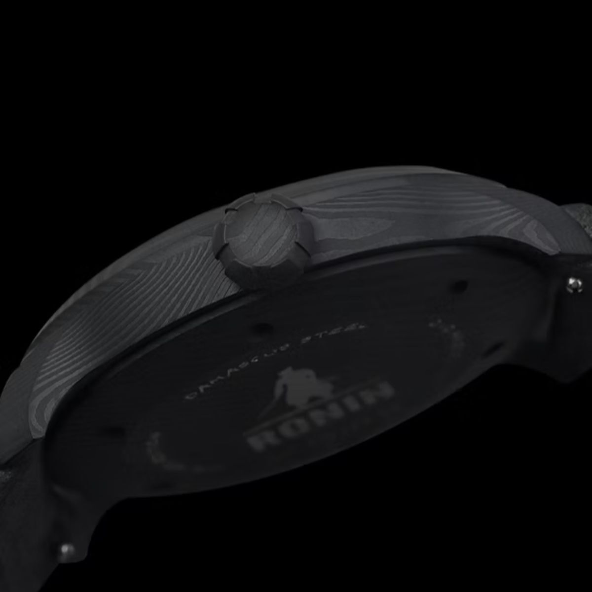 RONIN WATCHは、侍の刀剣に息づく精緻な職人技から着想を得ており、ダマスカス鋼を用いたそのデザインには伝統の魂が織り込まれています。武士道の精神を映し出し、力強さと揺るぎない信念を示す時計です。
