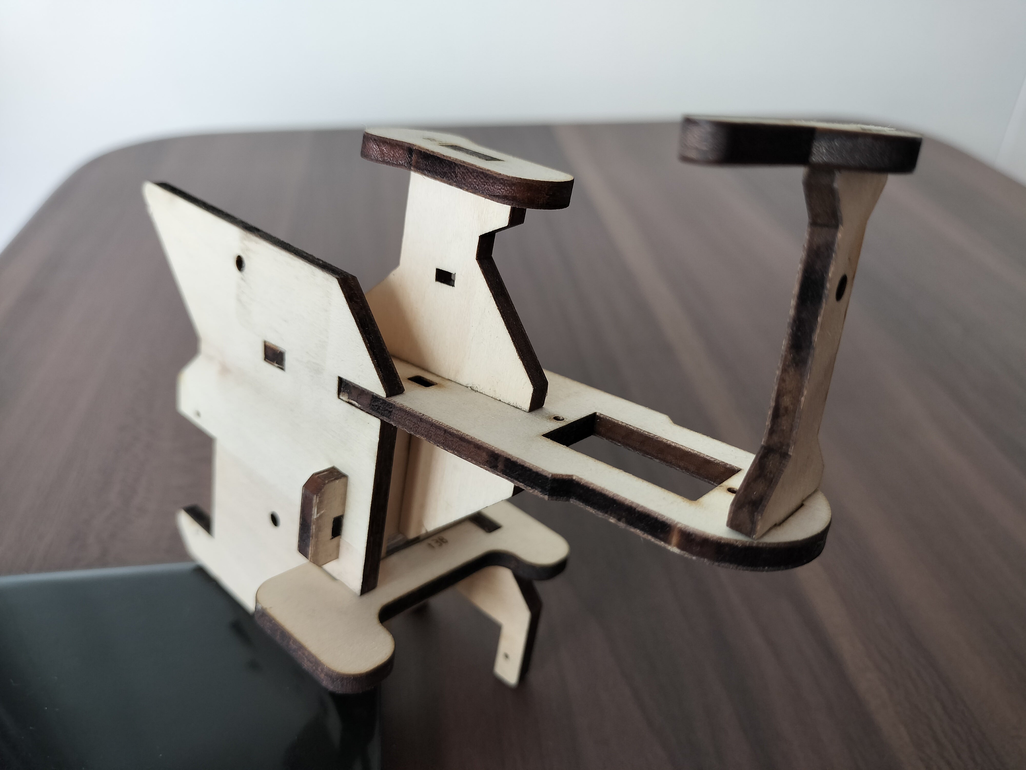 キットの内容(試作品)【フレーム、車輪】材質はシナベニヤ、軽量で加工性に優れ、レーザー加工により、少量でも高精度な部品製作が可能。スロットイン+接着剤で組立。