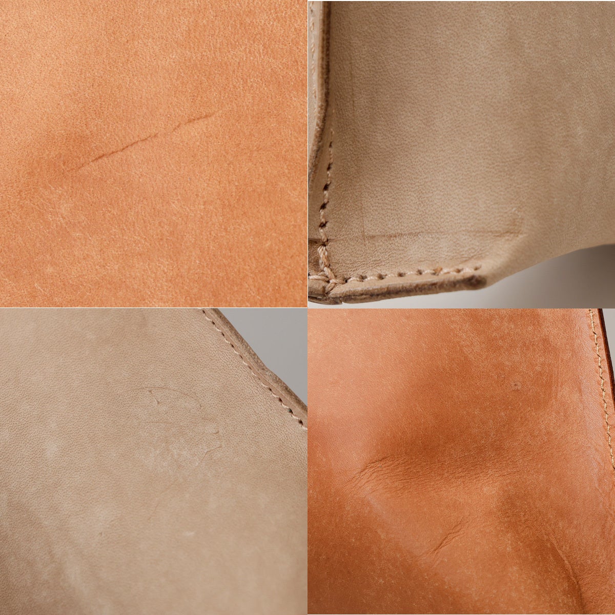 ベジタブルタンニン鞣し革は他の革と違い、必ずそうした天然傷が隠せない素材です。トートバッグのように一枚革で大きく部位を取れば取る程、必ずどこかにそうした傷部分等が入ってしまいます。当製品では、そうした箇所はなるべく目立たない場所になるよう意識し裁断しております。