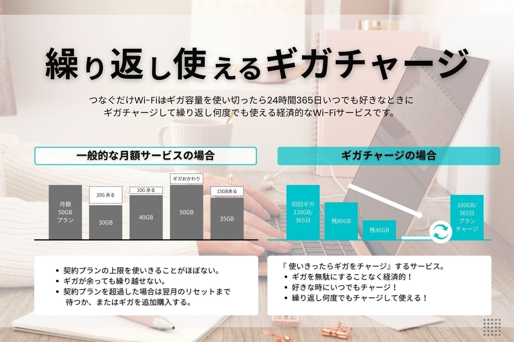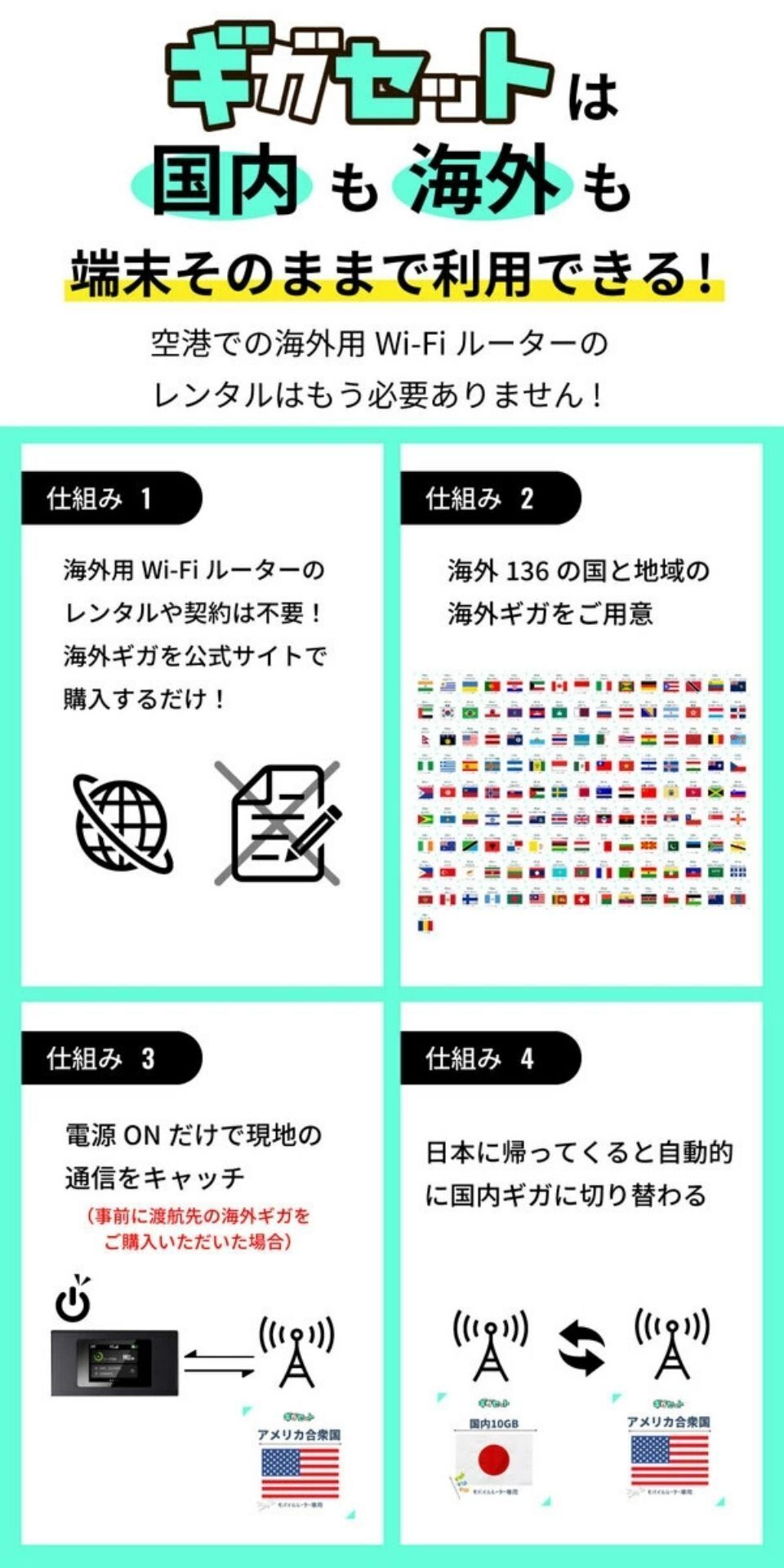 従来のモバイル通信といえば、契約手続きや月額契約、契約期間の縛り、さらには契約手数料や解約手数料といった“しばり”が当たり前でした。私たちはその常識を覆し、「ギガ付きモバイルルーターを買うだけで、すぐにWiFiが使える」仕組みを実現しました。その名も 『ギガセットWi-Fi』。