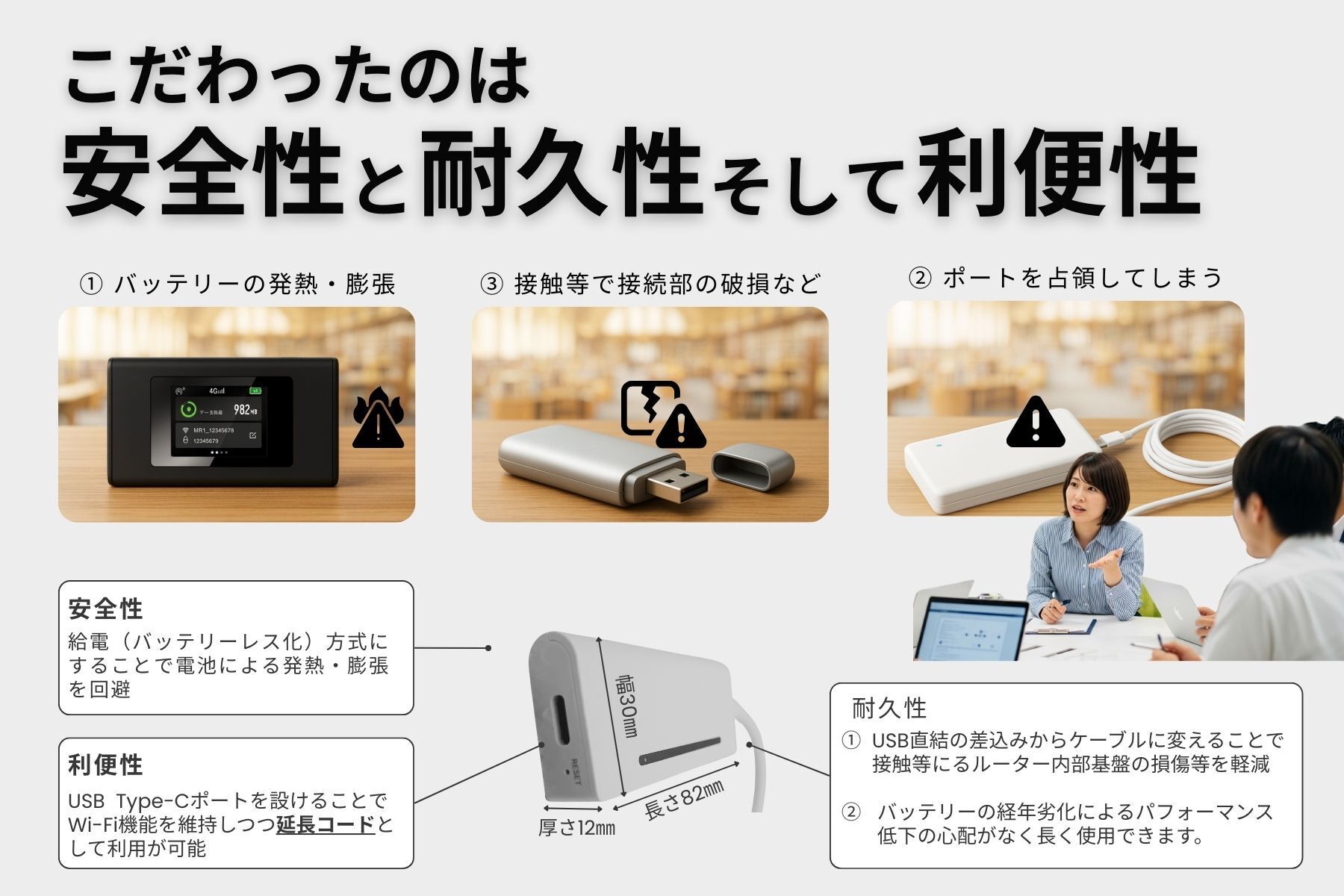 そこで私たちが選んだ答えが 「バッテリーレスモバイルルーター」 です。実はこれまでもバッテリーレス製品を扱ってきましたが、実際の販売・運用を通じてそのメリットだけでなく弱点も熟知しました。