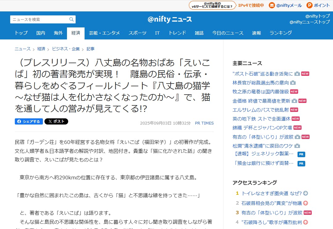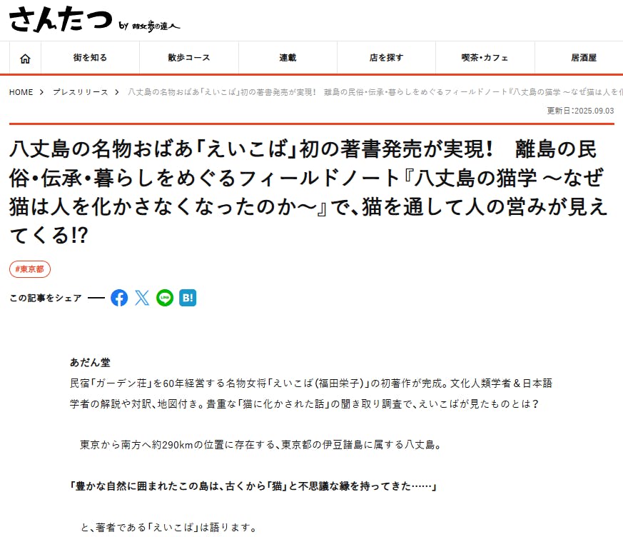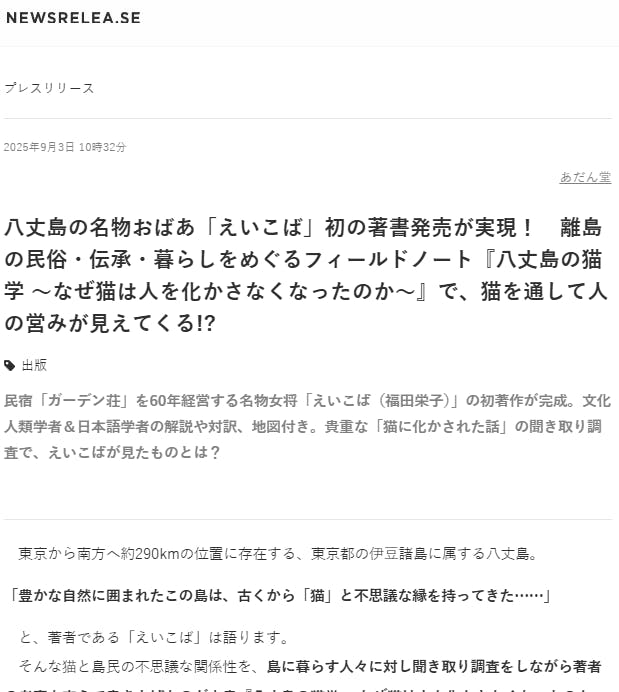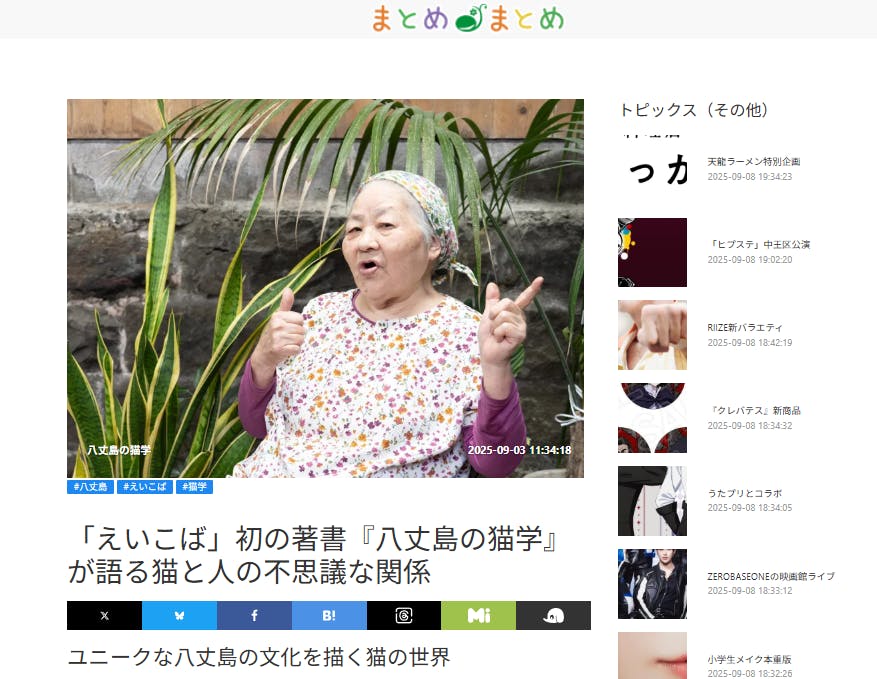 「日常をよりカジュアルに」をコンセプトにした、情報まとめサイトである「まとめまとめ」さん。Googleで「八丈島の猫学」と毎日エゴサをしまくっているのですが、プレスリリースを出して当日のうちには記事の掲載をいただいたことに気付きました! ありがとうございます!