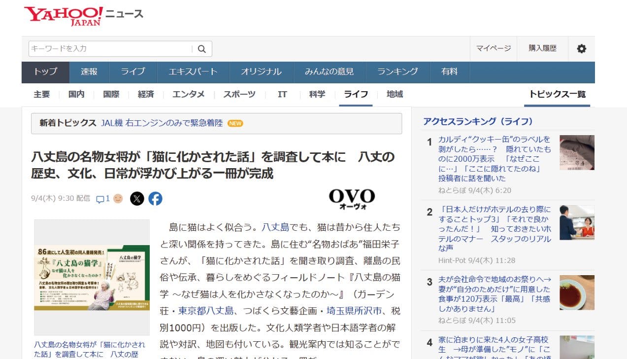 「OVO」さんが掲載くださったことで、この記事がYahoo!ニュースにも転載いただけることとになり、まさかの、本書がYahoo!トップページに掲載された(新着記事)のは嬉しかったです~! ありがとうございます!