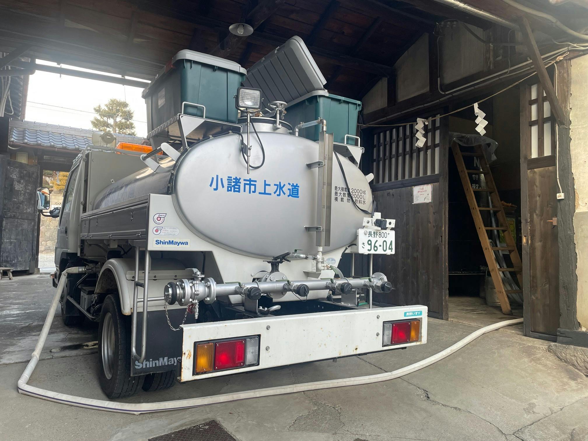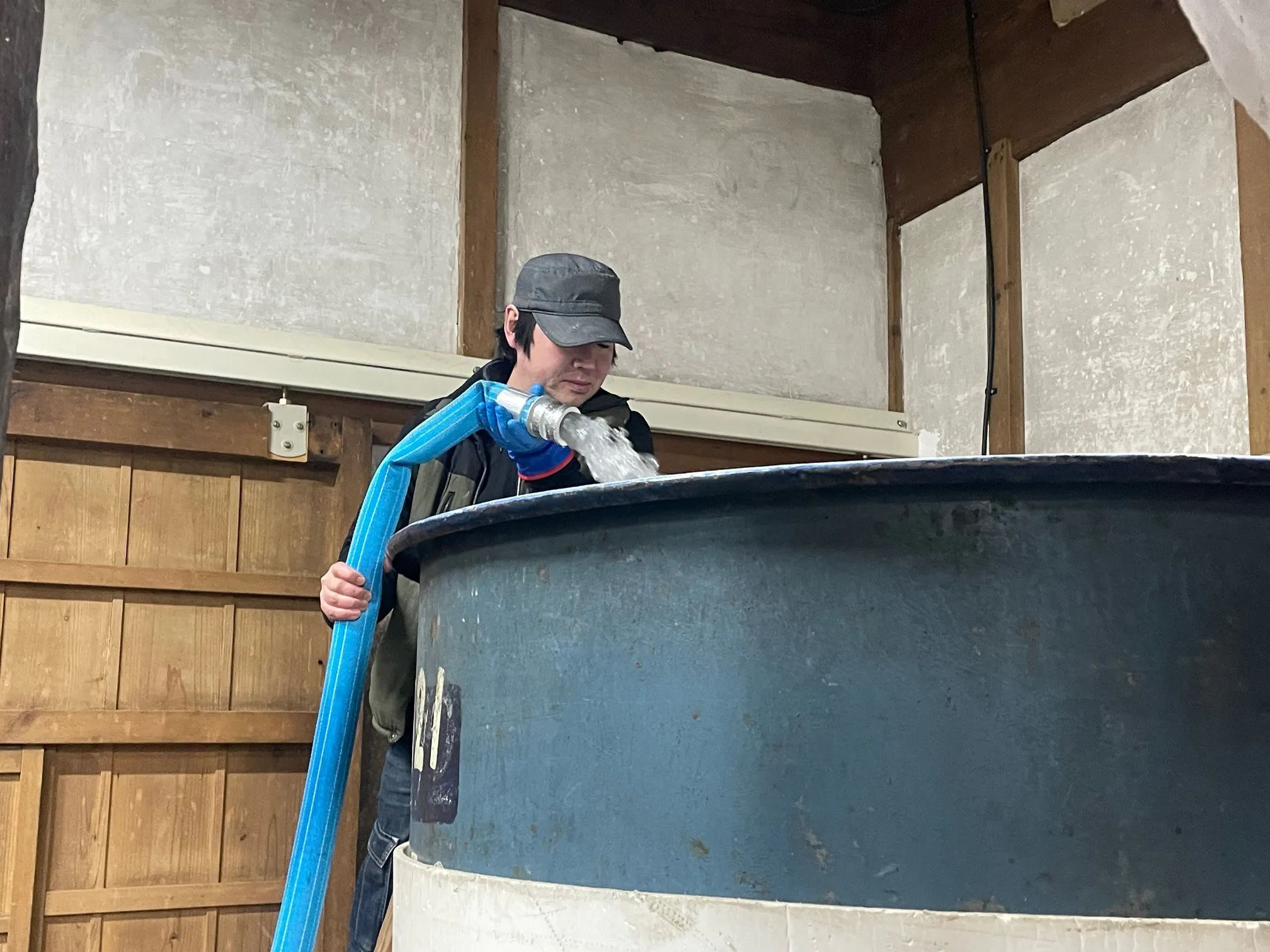 酒蔵の入口に駐めた給水車から長いホースを伝って、いつも見ることのできない秘密の部屋へ。