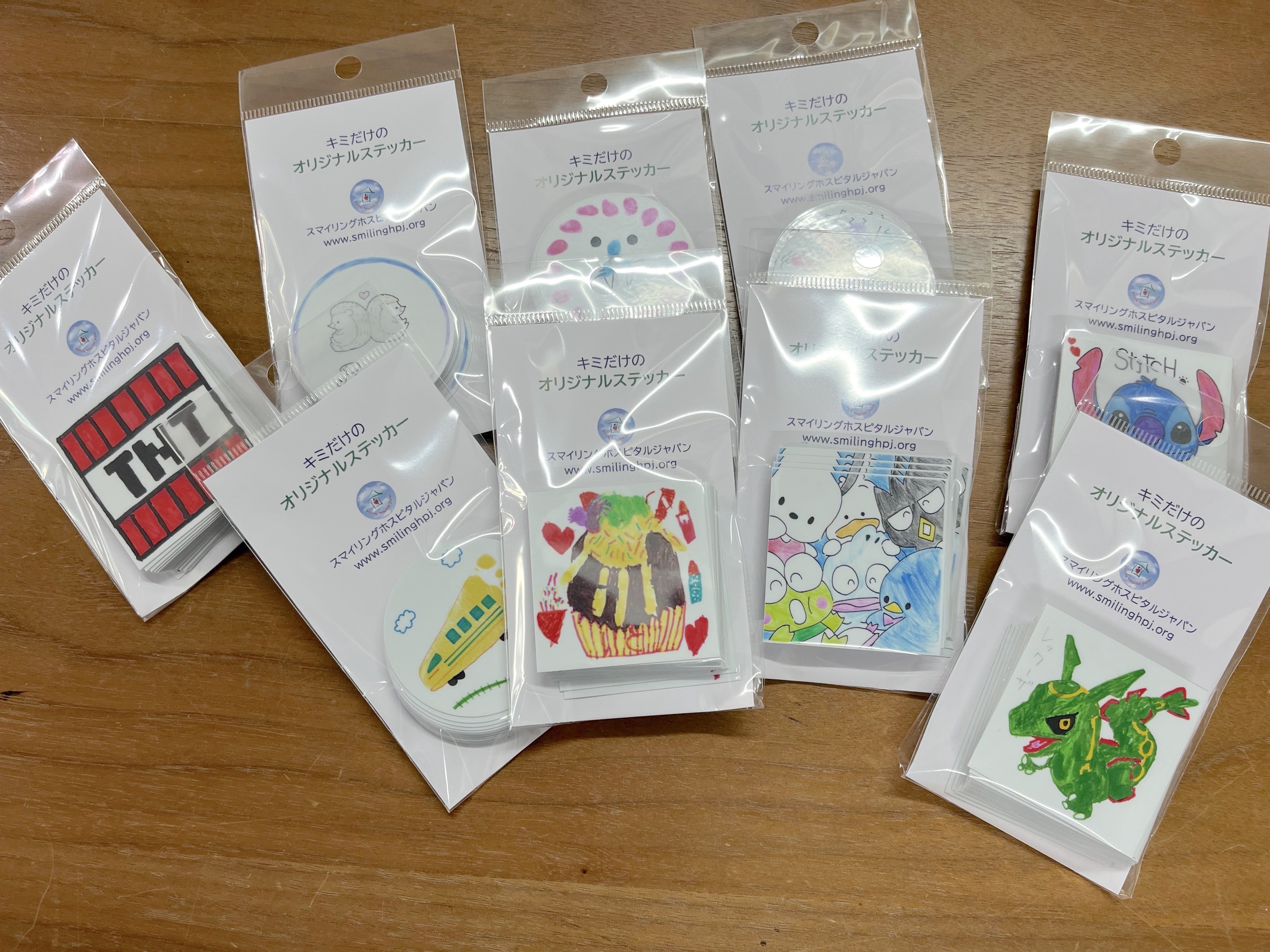 丸と四角のフォーマットから好きな方を選び描画、コラージュなどを施してもらい、保育士さんが集めてSHJに送ります。協力企業のステッカー会社にステッカー加工してもらい1つの絵につき20枚セットで子どもたちの元へ送ります。選ぶ、描く、待つ、使う、という段階それぞれがワクワクの時間です。病棟にいる他の子と名刺代わりに交換して仲良くなったり、退院して友達に配ってスムーズに仲間に戻れたり、という話を保育士さんから聞いていて、コロナ禍が過ぎても人気のワークとして喜んでいただいています。