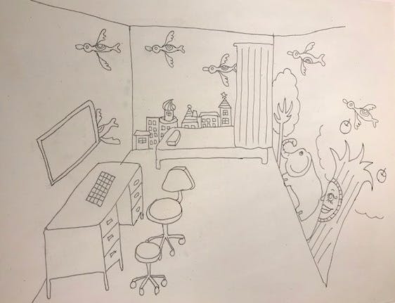 このイメージ図は子どもたちが一番入りたがらない処置室です。注射やさまざまな検査、処置から気持ちを少しでも和らげられるよう、楽しく明るくなるようデザイン中です。子どもたちのデザインしたモチーフもところどころに配置します。