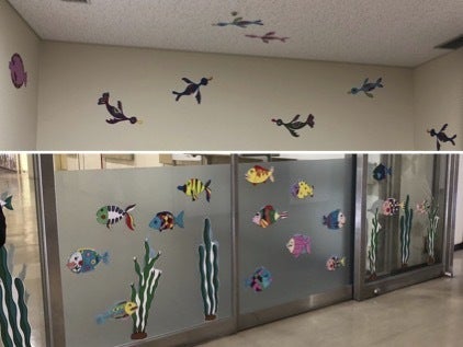 全体のデザインはアーティストが、配置は子どもたちの目線や動線に気を配りながら保育士さんと相談して決めていきます。例えばストレッチャーに乗ったまま手術室等に向かう子どもの視界の主は天井。だから天井にもUFOや飛行機、鳥などを飛ばします。退院後の外来受診後、病棟を訪問した時に自分の作品が病棟の入り口を飾っているのを見ることができたら!というアイデアも保育士さんによるもの。前回は病棟の入り口に海底を泳ぐ魚と水草を描きました。