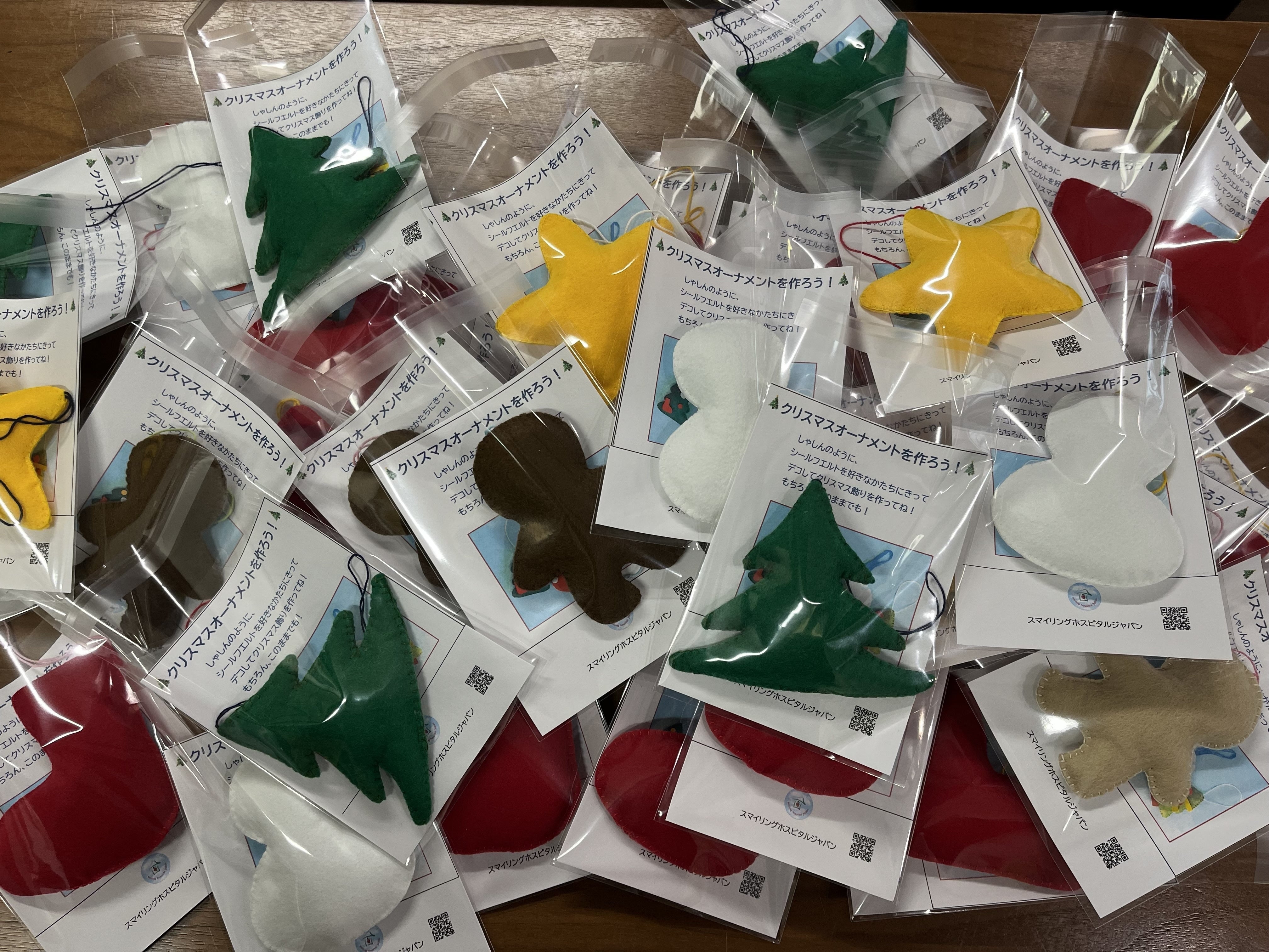 お陰様で目標額の94.8%まで支援が集まりました。あともう少しでこのプロジェクトをさらに続けるための基盤が出来上がります。引き続きよろしくお願いします。さて、このプロジェクト同様、私たちは普段から子どもたちの感性を大切に自ら手を使って創作することを大切にしていますが、コロナ禍、病棟にボランティアが入ることができなくなった中で始めたのが、制作キットのプレゼントです。その中で「スマホジちゃんマスコット人形制作キット」と並んで人気なのがこれからのシーズンにぴったりの「クリスマスオーナメント手作りキット」です。フェルト地でツリー、長靴、ジンジャーマン、雪だるま、星をぬいぐるみにしたものに自由に切ってデコレーションできるように5色のシールフェルトを添えたものです。目下、SHJちくちくチームが制作し順次小児病棟へ送っています。自分のベッドサイドに飾ってもよし、プレイルームのツリーにみんなで一緒にワイワイ飾ってもよし。入院しながら季節を感じられる要素を活動の中に取り入れることも私たちのこだわりの1つです。ハロウィンが終わり、さて次はクリスマス!。子どもたちにワクワクを届け続けていきます。応援のメッセージが続々届いています。次回はその中からご紹介できたらと思います。