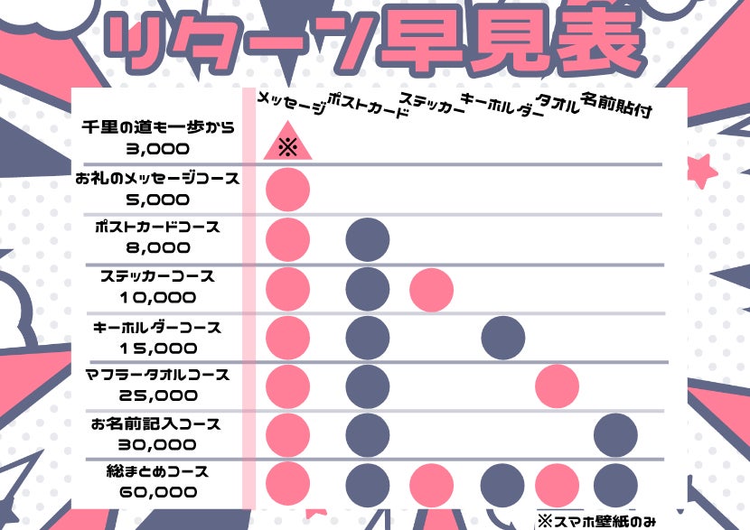 お礼のメッセージをはじめ、オリジナルポストカード・ステッカーセットやキーホルダーから新作のマフラータオル、そしてお名前をマシンに貼り付けて走るプランなどを用意しました。