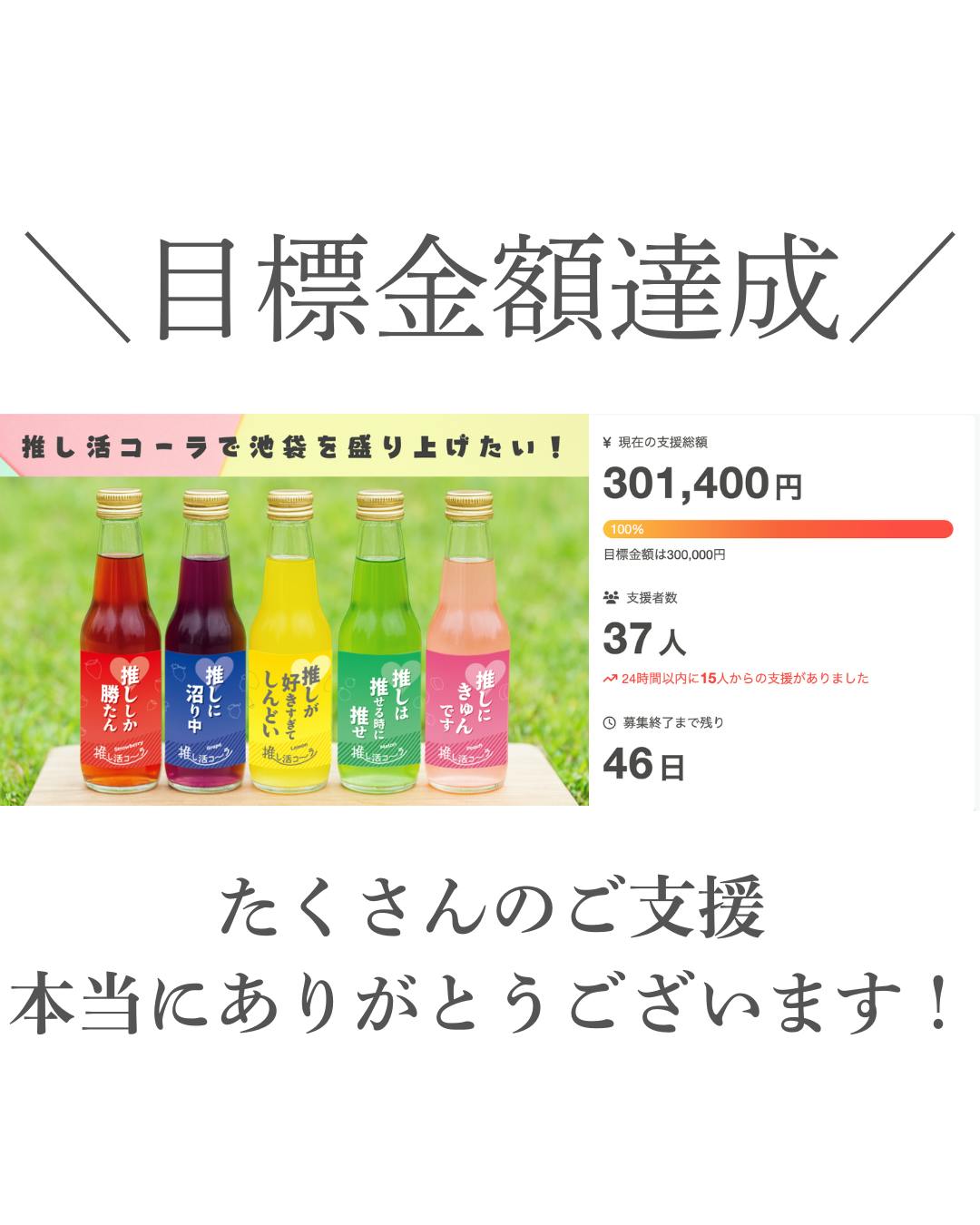 2025/11/12 11:57ご支援いただいた皆さまへこんにちは!「推し活コーラ」クラウドファンディング主催者の池袋の新也です。このたび、皆さまからの温かいご支援のおかげで、クラウドファンディングの目標金額を達成し、無事「推し活コーラ」の販売をスタートすることができました!現在、ネットショップでも少しずつご注文が入り始めており、今週末には池袋・イケサンパークで開催されるファーマーズマーケットにも初出店いたします。(※11月初旬の出店は天候により中止となっておりました)こうして一歩ずつ進めているのは、皆さまがこの企画を信じて応援してくださったおかげです。改めて、心から感謝申し上げます。リターンの発送については、11月中に順次発送を予定しております。(※リターン「押し活グラス」については12月中旬となる見込みです)お届けまで今しばらくお待ちいただけますと幸いです。これからも「推し活コーラ」の世界を広げていけるよう活動を続けてまいりますので、引き続きあたたかく見守っていただけたら嬉しいです。いつも応援してくださり本当にありがとうございます!!!! もっと見る