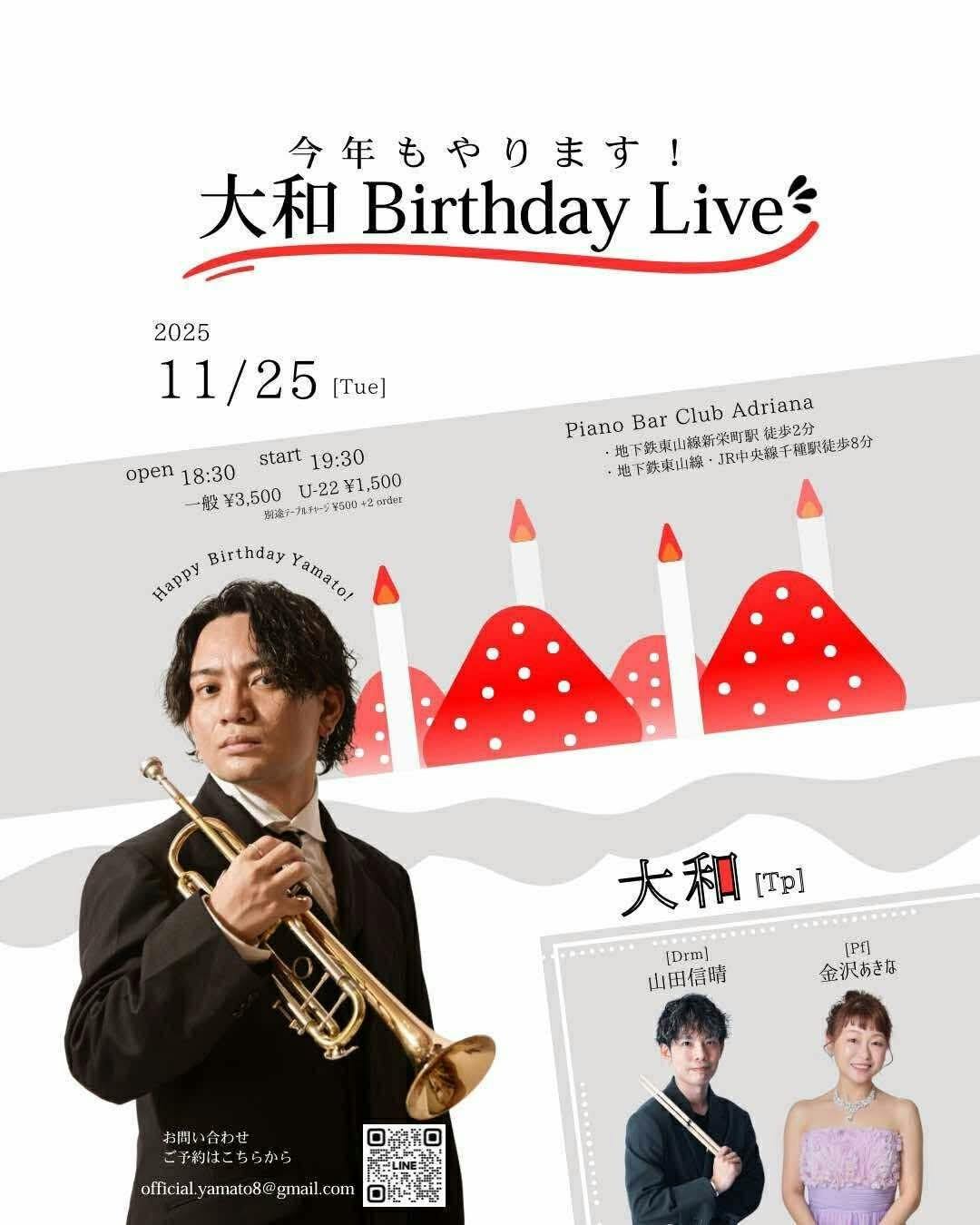2025/11/21 20:00来週は大和の誕生日です!33歳になります。30歳の4月に始めた活動もみなさんのおかげで、充実した毎日。そんなみなさんに感謝を込めて、演奏したいと思います。是非会場で一緒に時間を過ごしましょう♬.*゚ もっと見る