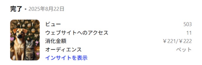 2026/01/18 15:53みなさまへこのたび、みなさまからの温かいご支援のおかげで、ペットショップでのペット購入が増える年末年始の時期に、「保護犬・保護猫を迎える」という選択肢を呼びかけるインスタ広告を発信することができました。インスタ広告の概要と成果を以下の通りご報告いたしますので、ご覧いただけますと幸いです。【広告の概要】◆実施期間:2025年12月1日~2026年1月16日(計47日間)(こちらの手違いで、1月14日に広告が一旦停止してしまい、当初の予定より終了日が1日延期しております。申し訳ございません。)◆予算:49,709円(ご支援金「61,000円」からCAMPFIREの手数料を差し引いた「49,593円」と、私が補った端数「116円」の合計金額です。)◆インスタグラム広告で使用した動画こちら◆インスタグラム広告のリンク先サイトこちら【広告の結果】◆インスタグラム広告 ・広告ビュー数:56,687件・動画3秒以上再生数:17,515件・リンクのクリック数:2,575件◆リンク先サイト・ページ閲覧数:2,013件【ご参考】◆インスタ広告の管理画面(金額やターゲットの調整等で、何度かに分けて配信したため、画面が複数に分かれています。)◆リンク先サイトの管理画面【最後に】今後も、自ら声をあげることができない動物たちに代わり、一つでも多くの命が救われる未来を目指して、様々な活動を続けていきたいと思います。あらためて、本プロジェクトへのご理解とご協力に深お礼申し上げます。ご支援、誠にありがとうございました。プロジェクト企画者 beings.log365 もっと見る【お礼とご報告】ペットを“買う”時代を終わらせよう!インスタ広告プロジェクト