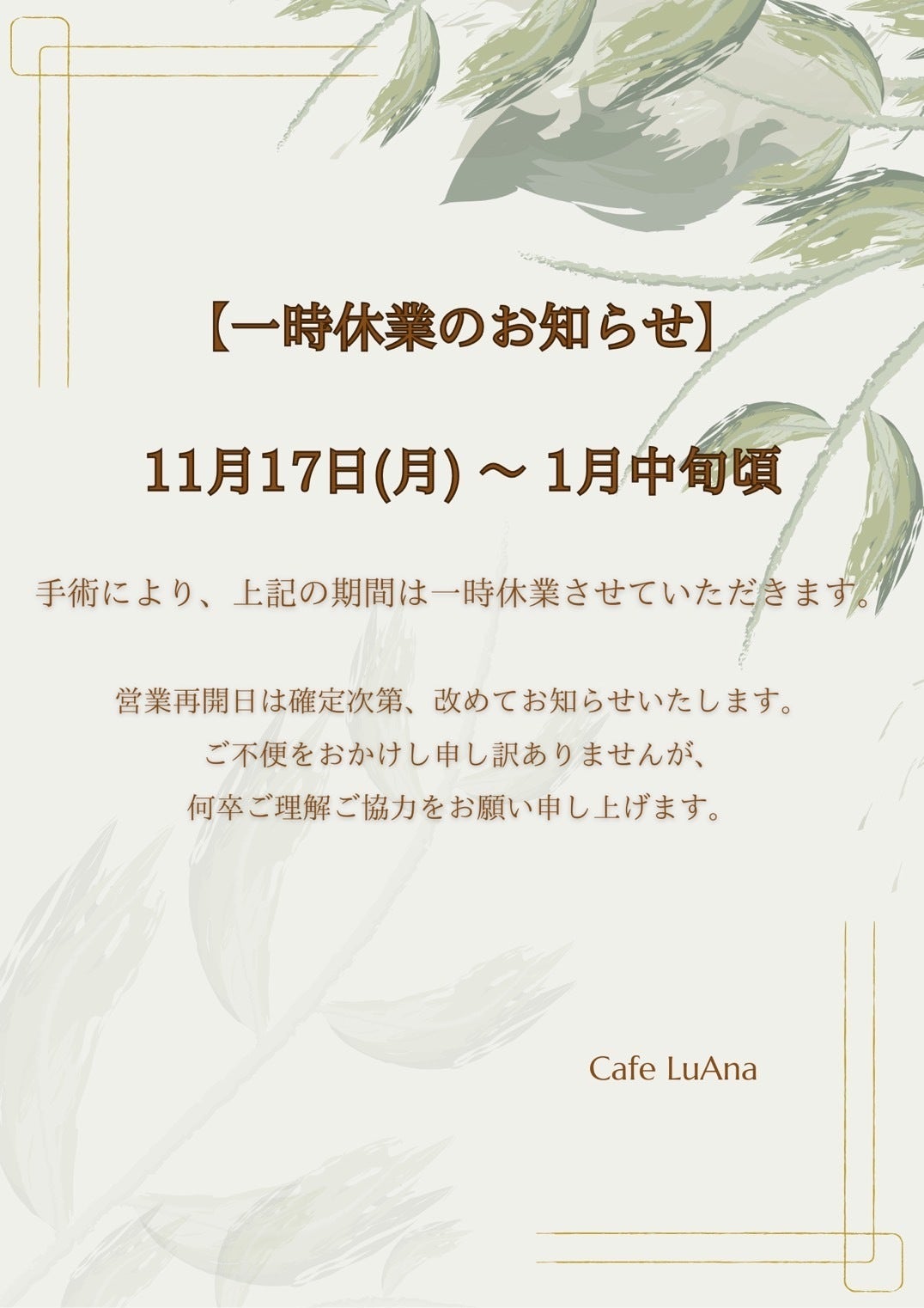 2025/11/16 21:07本日が、年内最終営業日でした。この1週間は常連様がたくさんご来店くださり、あたたかい励ましのお言葉をたくさん頂戴しました。本当にありがとうございました!やっと手術に挑めるという強い気持ちと、長期休業をしてお店を残しておいておけるのかという不安な気持ちがずっと入り乱れたこの数ヶ月。たくさんの方の励ましのお言葉や、このプロジェクトを通じて『このお店は残していかなきゃ』という決意が固まりました。その他に各方面からいろいろな形でご支援を頂戴し、年明けにまた皆さまとお会い出来る兆しが少し見えてきた段階です。まずは手術を受け、リハビリを着実に行い早期回復を目指して、一日も早く営業再開ができるよう、姉妹で力を合わせてがんばって参ります!このプロジェクトは、11月30日が締切です。引き続きよろしくお願いいたします!営業再開は1月中旬とお知らせしておりますが、正確な日付は決まり次第、告知いたします。約2ヶ月間、お休みを頂戴いたしますが、Cafe LuAnaを忘れないでいてくださると嬉しいです。皆さまに再会できる日を楽しみにしております。またお会いできる日まで…♡ もっと見る達成金額変更のお知らせ