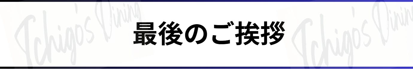 2025/10/07 23:069月30日をもちまして【Ichigo’s Dining】の営業を無事に終えることができました。強制立退の通達から駆け抜けた1ヶ月は本当にたくさんのお客様に足を運んでいただき、最終日の店内は終日あふれるような温かい雰囲気に包まれていました。この場所で過ごした日々は、皆さま一人ひとりの笑顔と応援に支えられてきた時間でした。【Ichigo’s Dining】は「皆さまとの繋がりが生まれる温かい場所」であり続けられたことを、心から誇りに思います。支えてくださったすべての方に、深く感謝申し上げます。本当にありがとうございました。そして皆さまへご報告です。このたび、【Ichigo’s Dining】の新しいお店の場所が決まり、契約が完了いたしました。新店舗の準備は決して楽な道のりではありませんが、皆さまに新しいIchigo’s Diningを最高の形でお届けできるよう、全力で進めてまいります。また、荷物の搬出や手続きなどに想像以上の時間がかかるため、現在の店舗は少しの間だけ延長してお借りすることになりました。9月30日をもって現店舗での通常営業はすべて終了しておりますが、スタッフの料理技術やサービスの感覚を維持し、新店舗での営業再開に向けてスムーズにスタートできるよう、社内研修や試作・練習を兼ねた限定的な営業を行う予定です。(一般営業ではなく、準備の一環としての活動となります。)なお、私とマネージャーは新店舗準備を最優先に動いており、しばらく店舗からは離れる形となりますが、時間が合う日には顔を出すこともあると思います。まだまだ長い道のりではありますが、次のステージで皆さまにお会いできる日を心から楽しみに、さらに頑張ってまいります。これからも応援宜しくお願いします。 もっと見る
