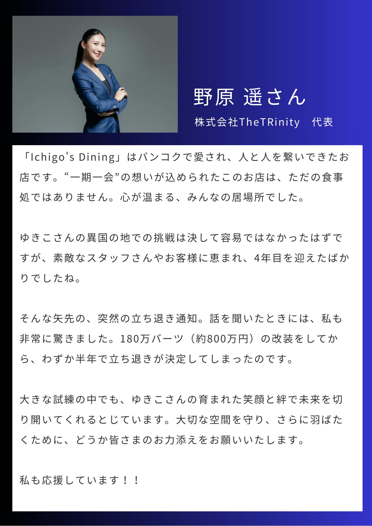 もしタイに来られましたら、必ずIchigo’s Diningにお越しください。お席をご用意して、お待ちしております。