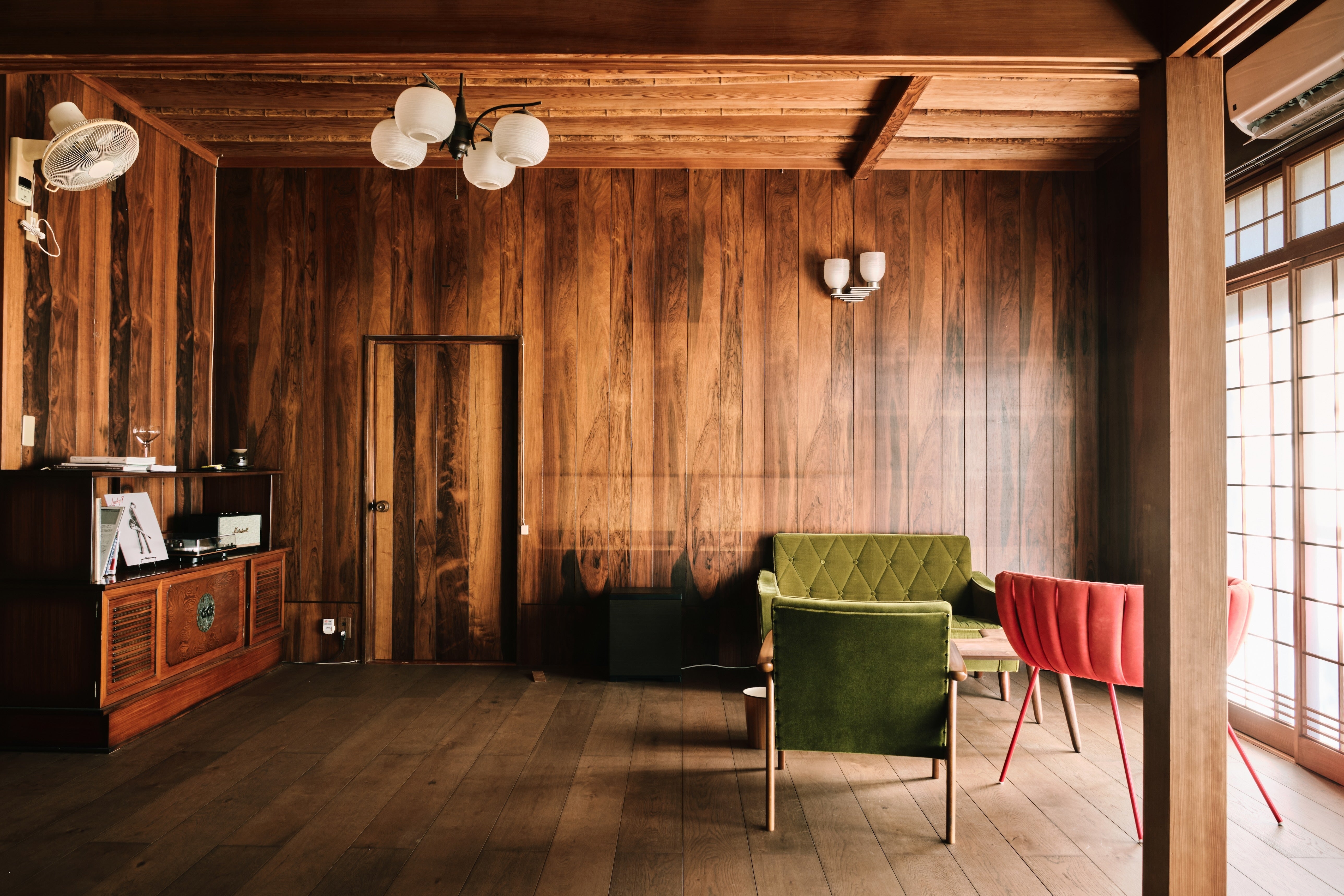 既存のリビングの床を張り替え、広めのフローリングにしました。また、家具も家の年代に合わせてミッドセンチュリー調のものに揃え、アクセントで赤のデザイナーズのチェアを入れております。元からあった棚(画面左)は綺麗な状態で、部屋にぴったりの風合いだったので掃除してそのまま使用しております。お客様にゆったりと自分時間を過ごしていただけるように、Bluetooth対応のスピーカーとレコードプレーヤーを置いております。クラシックを中心にレコードを揃えていますが、今後は他のものも揃えていきたいなと。次回は和室についてご紹介していきます!