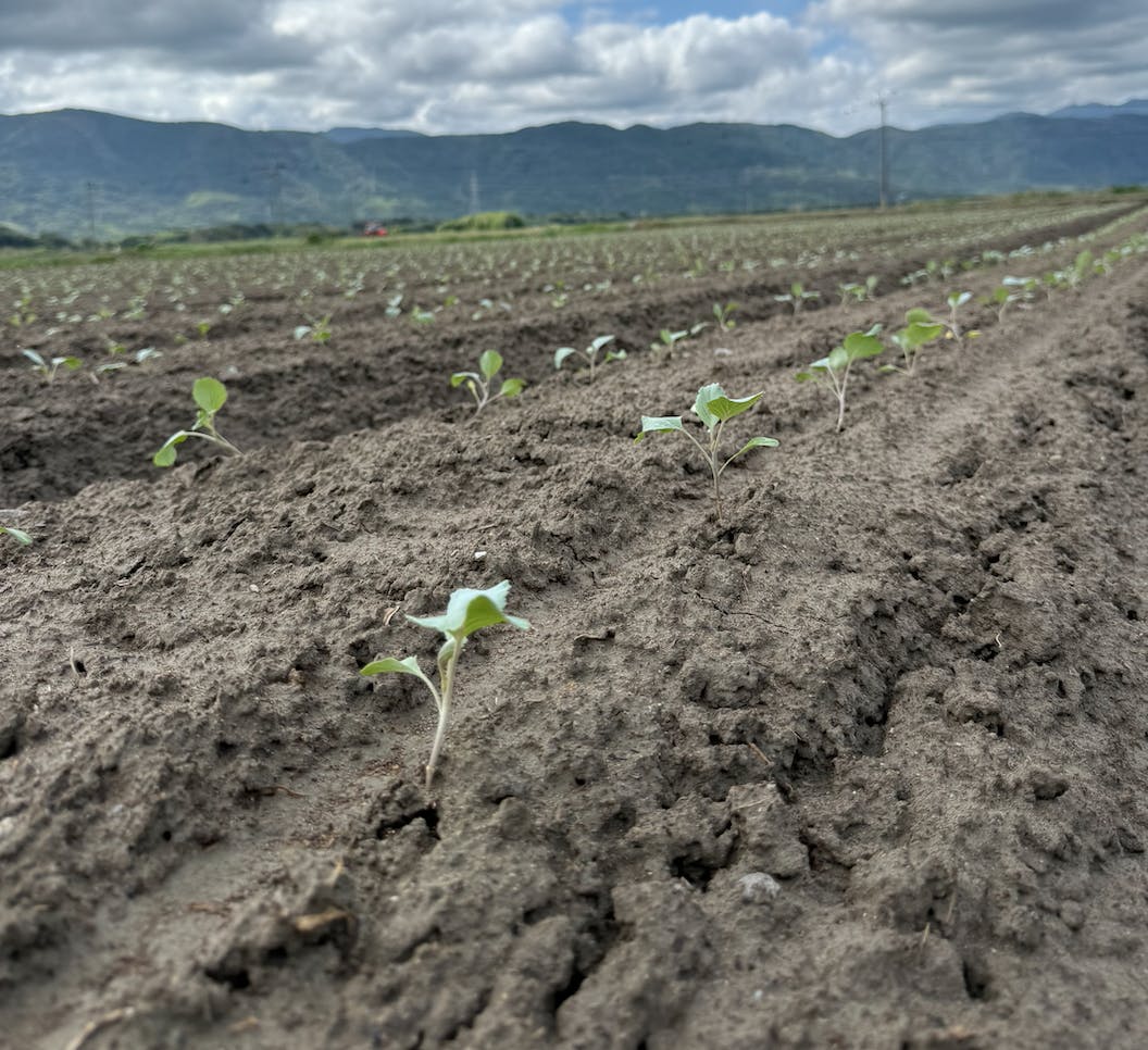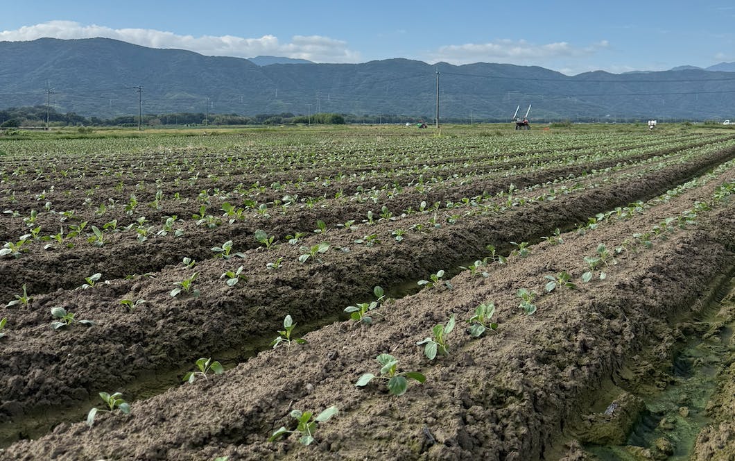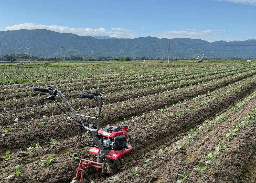 現在、クラウドファンディングの返礼品となるキャベツの定植を行い、草の処理や丁寧に幸運機を使いキャベツの苗を育てております。