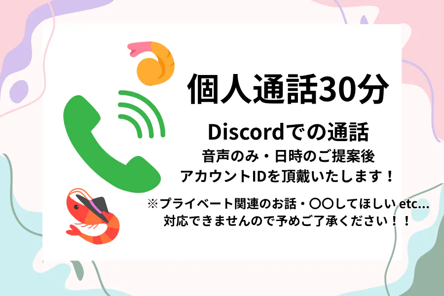 ※お話に際しアカウントIDを日時が決まりましたら頂戴いたします、またお話対応ができない内容がありますので予めご了承ください(可否が判断し兼ねるものは事前にご質問ください)