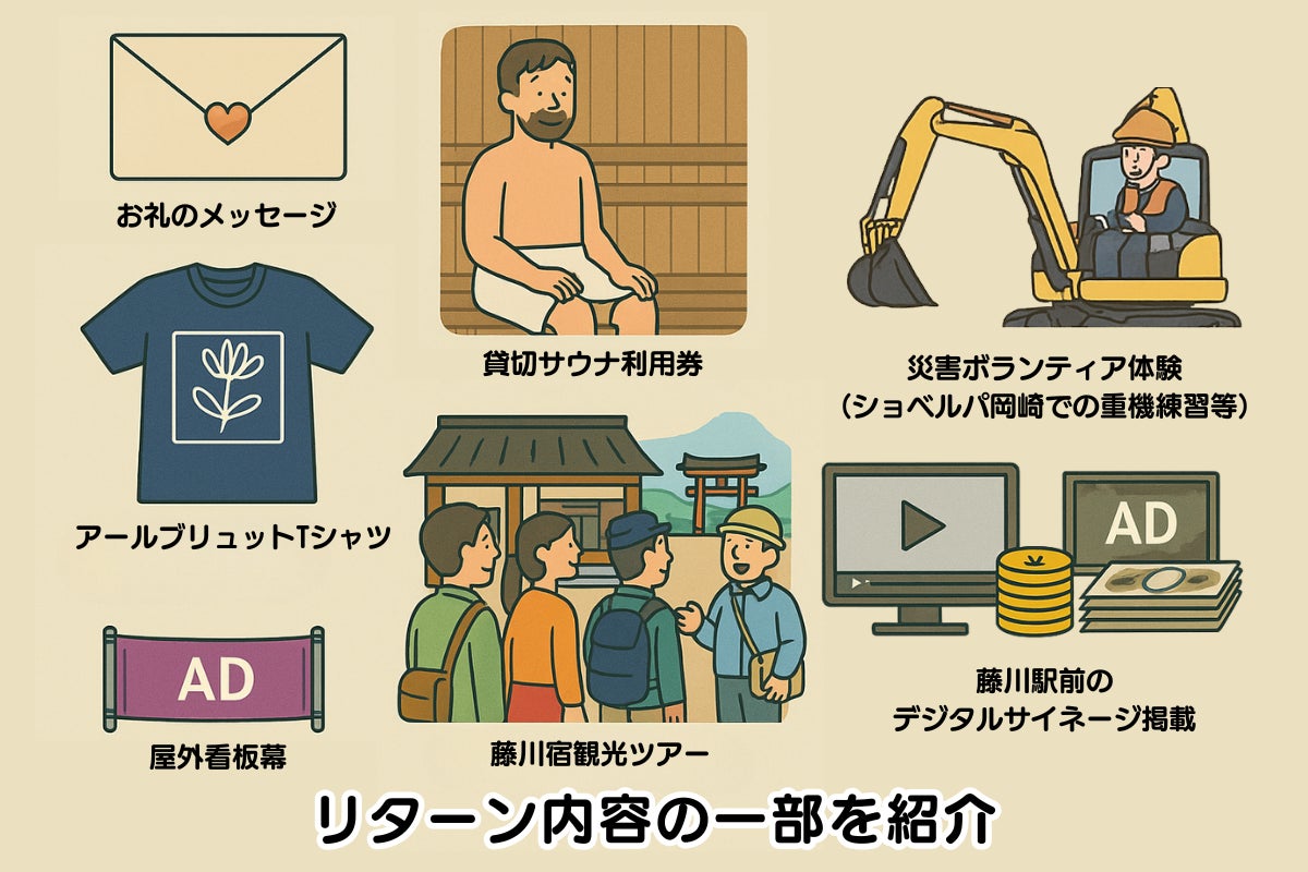 さらに、藤川駅前のデジタルサイネージ広告掲載や、屋外看板幕など、企業・団体様向けのPRリターンも充実!