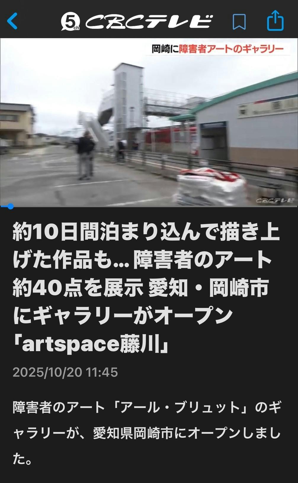 2025/10/22 19:00本日、駅裏プロジェクトのアート展示場がスマートニュースとCBCにて紹介されました。CBCスマートニュース駅裏プロジェクトでは、子どもや学生、お年寄りの方々はもちろん、障がいをお持ちの方々にとっても「必要とされる場所」でありたいと考えています。私たちは、障がいを“個性”のひとつとして捉えています。アートを通じて、誰もが触れ、感じ、そして共感し合える時間と空間をつくることを目的としています。澤拓郎アート展示場これからも、すべての人が笑顔で集える居場所づくりを目指して活動を続けてまいります。引き続き応援をよろしくお願いいたします。 もっと見る