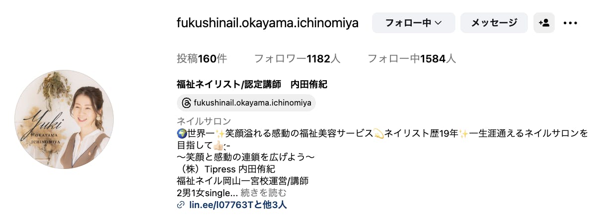 加えて、福祉ネイリスト認定校 岡山一宮校にて福祉ネイリスト認定講師も務め、福祉ネイリストの仲間たちと『福祉ネイル』を岡山中に広げるためにも、日夜活動しています!