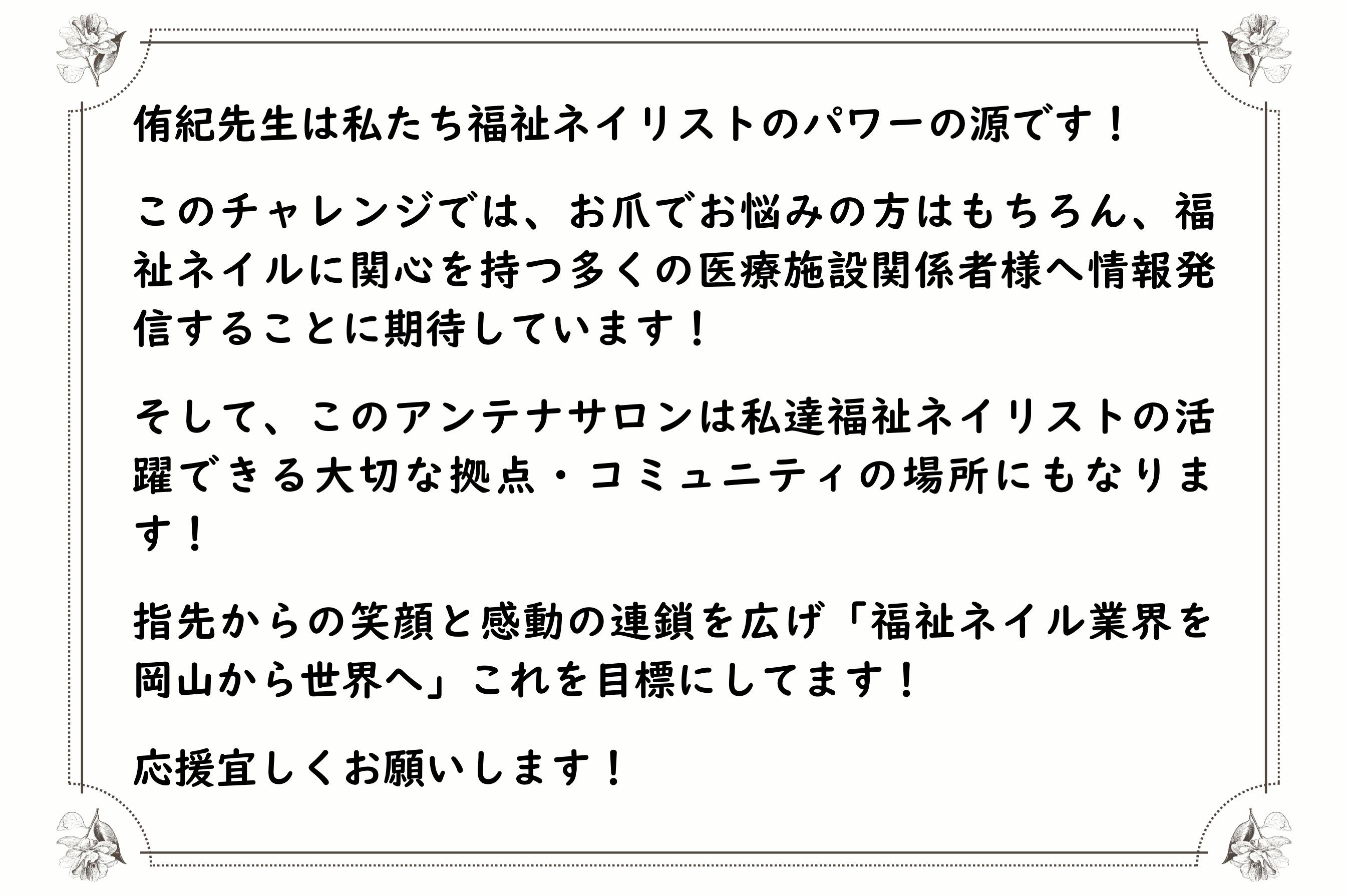 福祉ネイルにご興味をお持ちの方にご来店頂き、共に福祉ネイルを岡山に広げ、岡山で福祉ネイルを盛り上げて行けたらこれほど嬉しいことはありません。