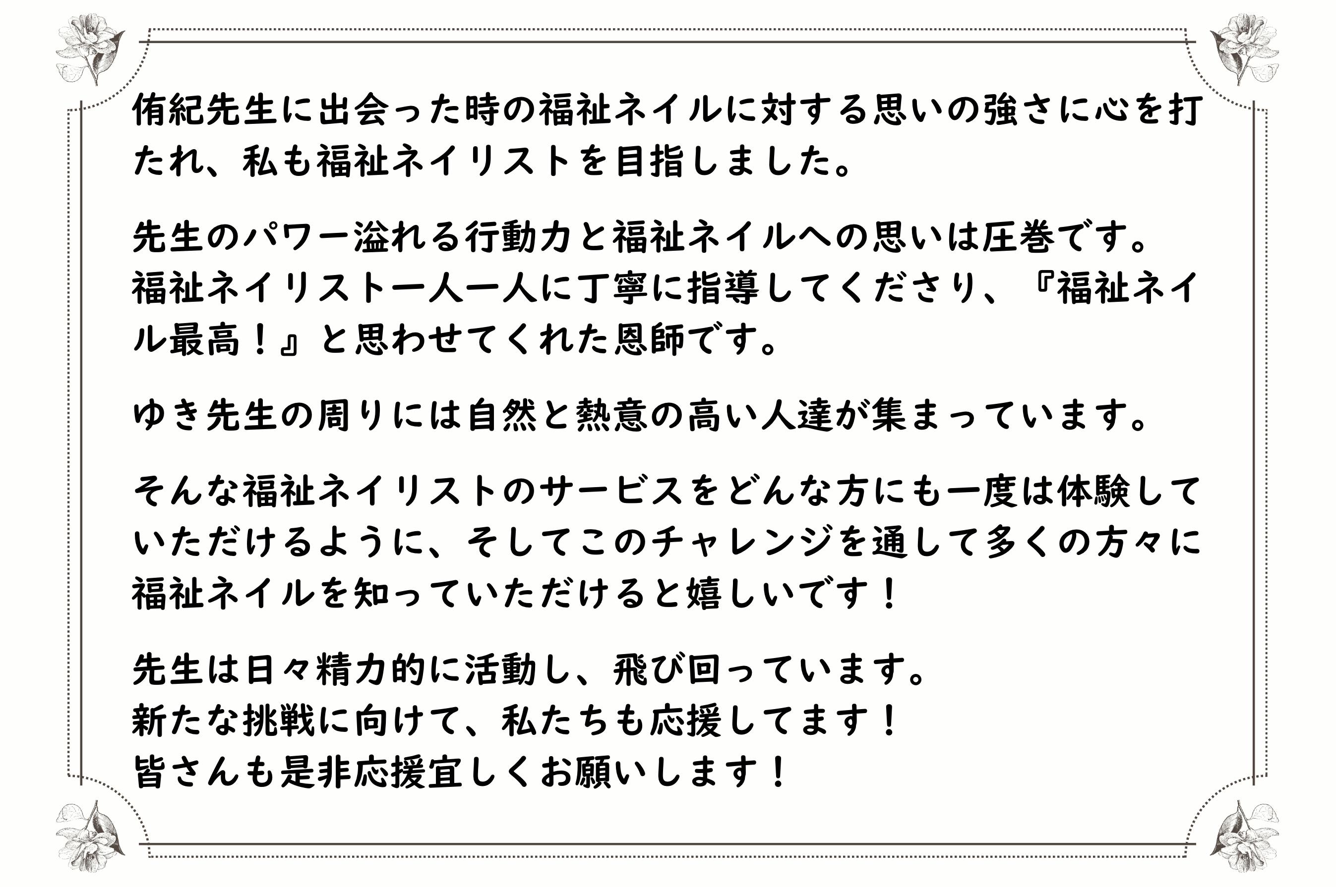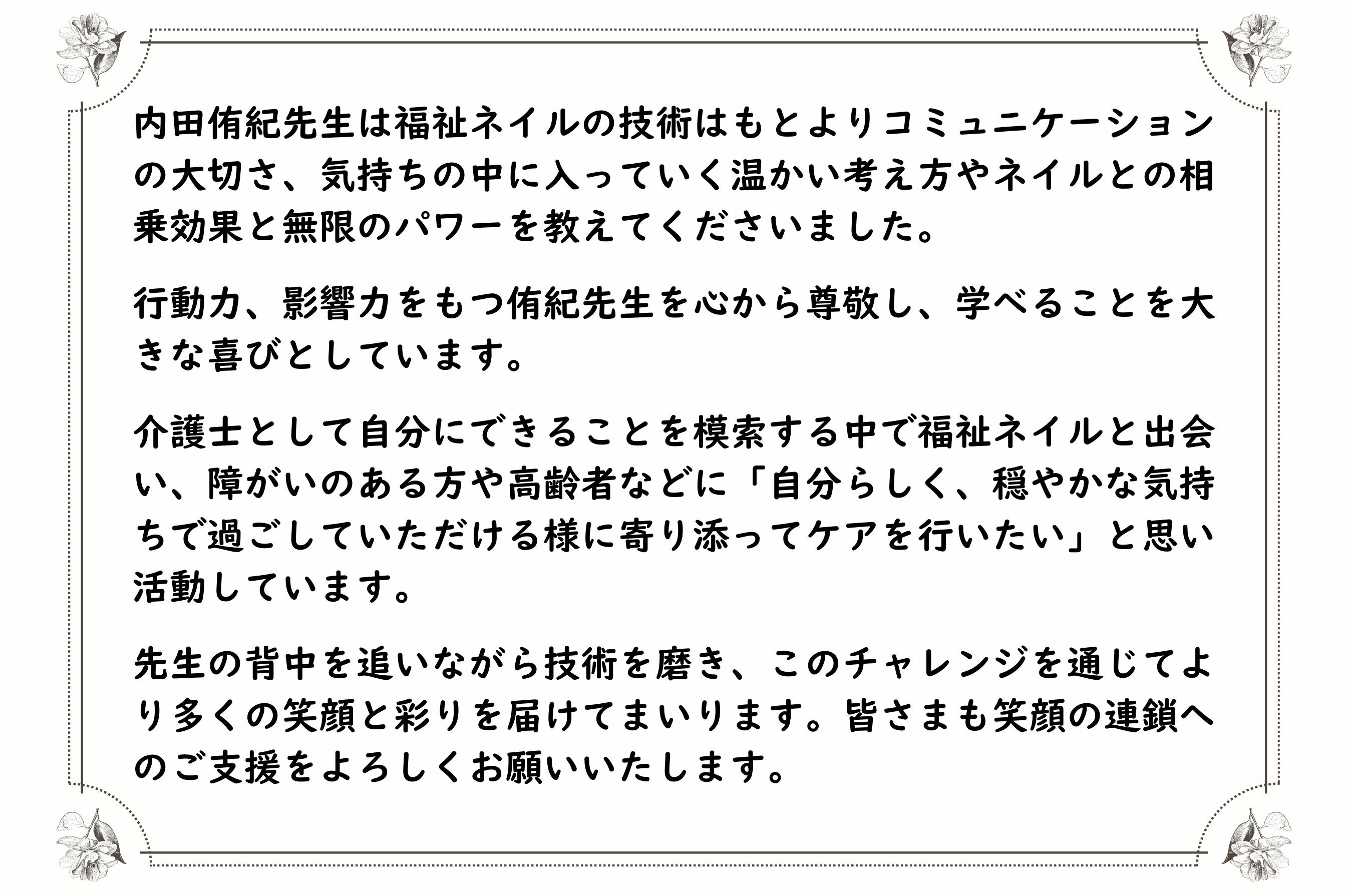 福祉ネイルでは、これまでのネイル常識を上回る学びと経験をすること、福祉という新たなジャンルにチャレンジできたことで、自分自身の成長と可能性を膨らますことができました。