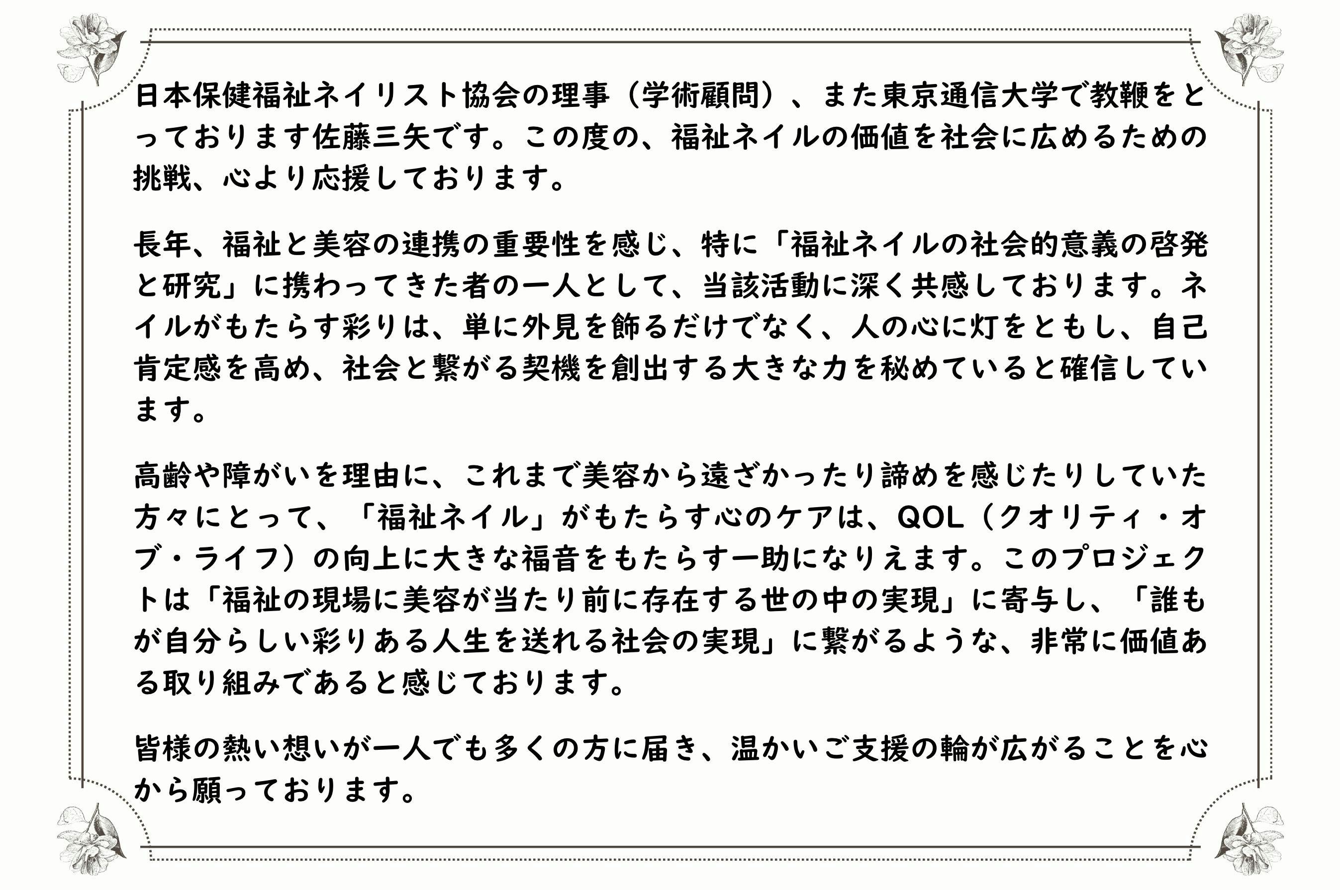 私一人ではそれが難しいかもしれませんが、福祉ネイリストの仲間たちと着実に確実に進めていきたいと思っています。