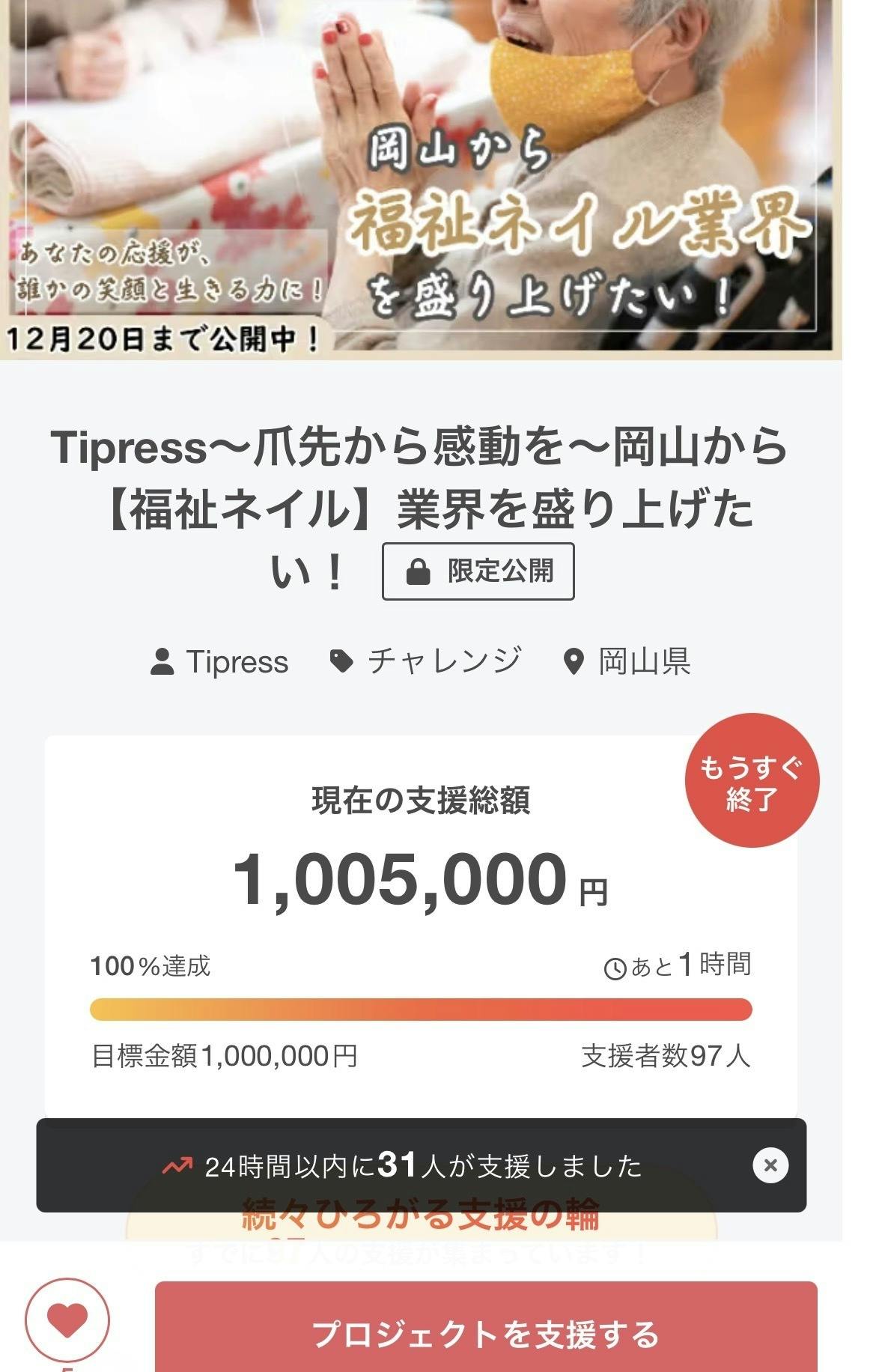 2025/12/22 09:13ご報告✦.*とお礼ꈍ .̮ ꈍ無事にチャレンジ終了˙˚ᜊ ᜊ˚˙みなさまのおかげで目標達成もすることができました!!目標100万円結果104万5千円これも、みなさまのご支援・応援のおかげです⚐˒˒最後まで応援していただいて諦めずに走り切ることができました( ꈍᴗꈍ)本当にありがとうございました˖ ࣪⊹幸˖ ࣪⊹嬉˖ ࣪⊹泣これほど福祉ネイルを応援くださり、これからの活動に夢と希望を感じて頂き本当に嬉しいです࣪𓏲ּ ᥫ᭡ ₊ ⊹ ˑ ִֶ 𓂃そして何より、このチャレンジを通して𓍯メンバーとの絆や、みんなの想い𓈊ˊ˗これらは、私にとって背中を押してくれる𝑷𝑶𝑾𝑬𝑹であり♡ご支援金以上の価値を感じる私の宝物です⋈ *。このチャレンジをさせて頂けたことにも感謝して、みなさまの想いに応えるために新しいSTEPへ進んで参ります♡今後とも「福祉ネイル」をよろしくお願いします꒰ঌ໒꒱𝑻𝓲𝓹𝓻𝓮𝓼𝓼 〜笑顔と感動の連鎖〜内田侑紀 もっと見る