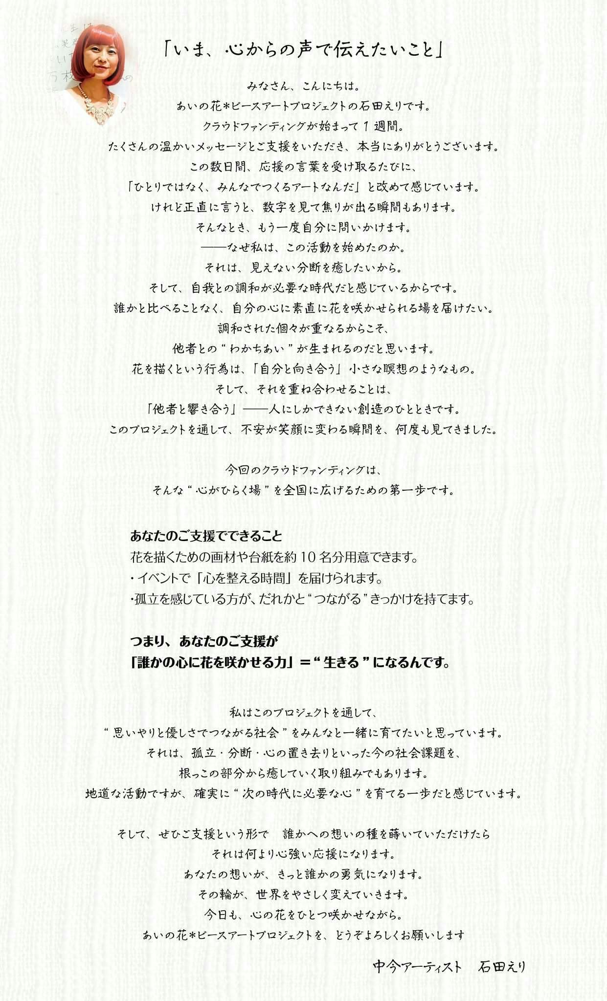 数字や結果を越えて、えりちゃんが「なぜこの活動をしているのか」をまっすぐに見つめ直したこの手紙は、あいの花というプロジェクトそのものの“原点”に触れさせてくれるように感じました。