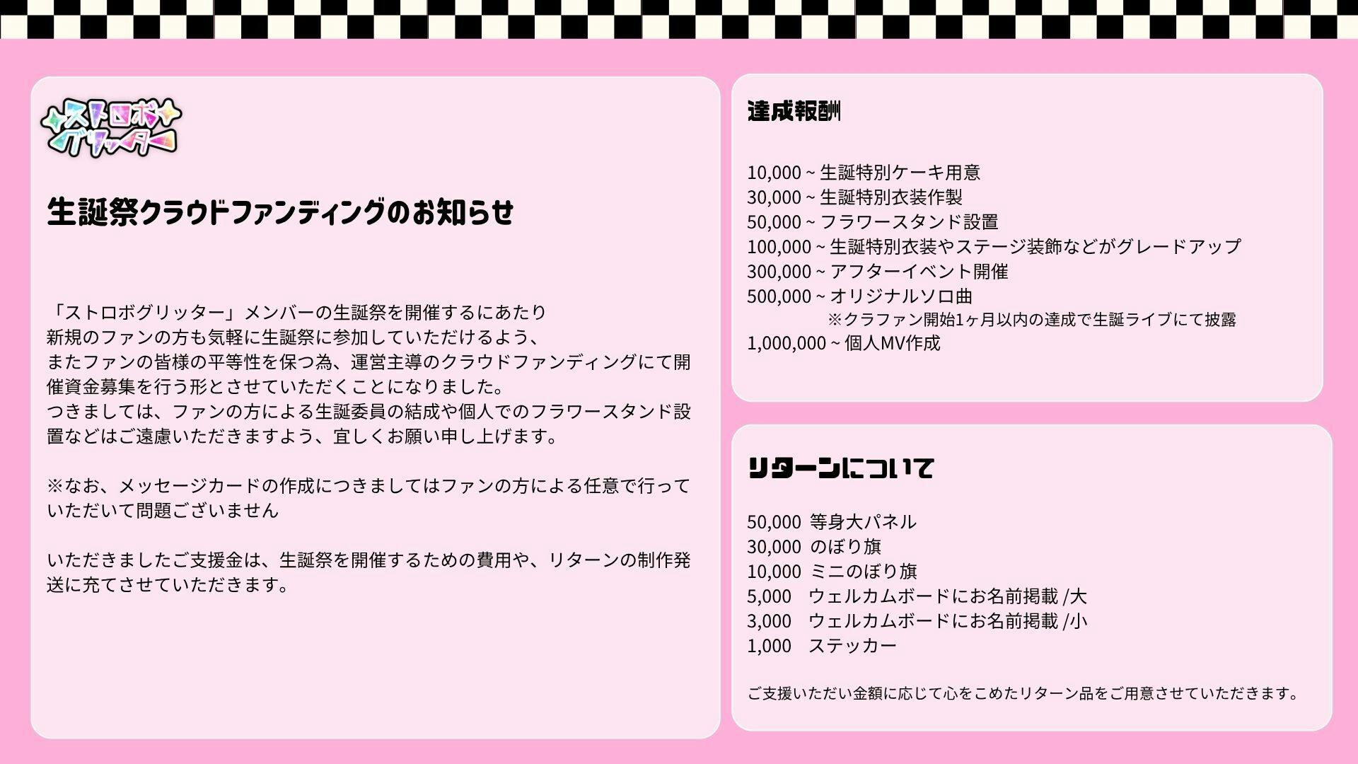・この度 【ストロボグリッター】のメンバーの生誕祭を開催するにあたり、新規のファンの方も気軽に生誕祭に参加していただけるよう、またファンの皆様の公平性を保つ為、運営主導のクラウドファンディングにて開催資金募集を行う形とさせていただくことになりました。