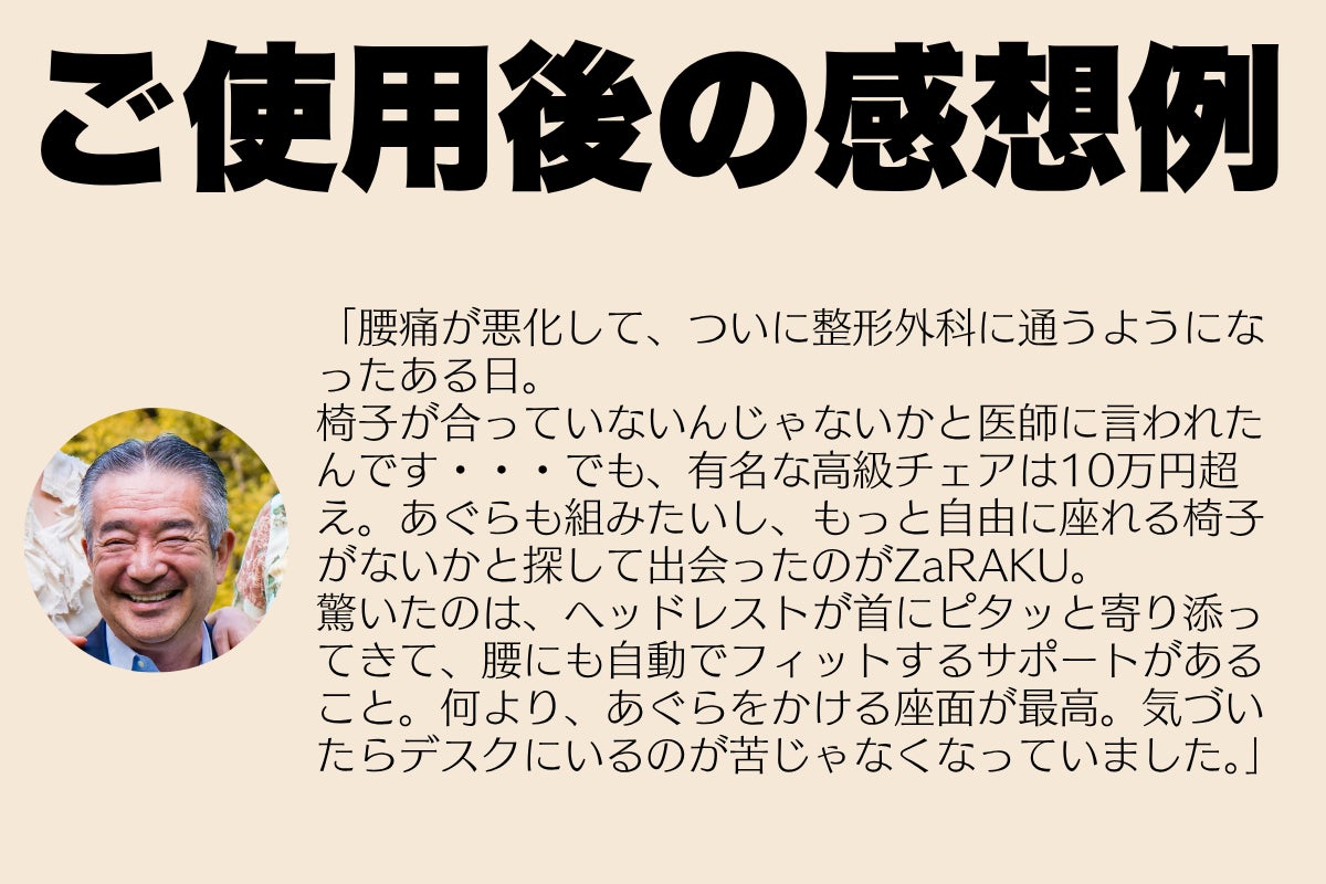 A:はい。実際に10万円以上のチェアと同等のエルゴノミクス構造を備えており、そのうえ、ZaRAKUは「あぐらがかける自由さ」と「人間工学機能が揃っている」を両立させた、なさそうである次世代のワーキングチェアです。