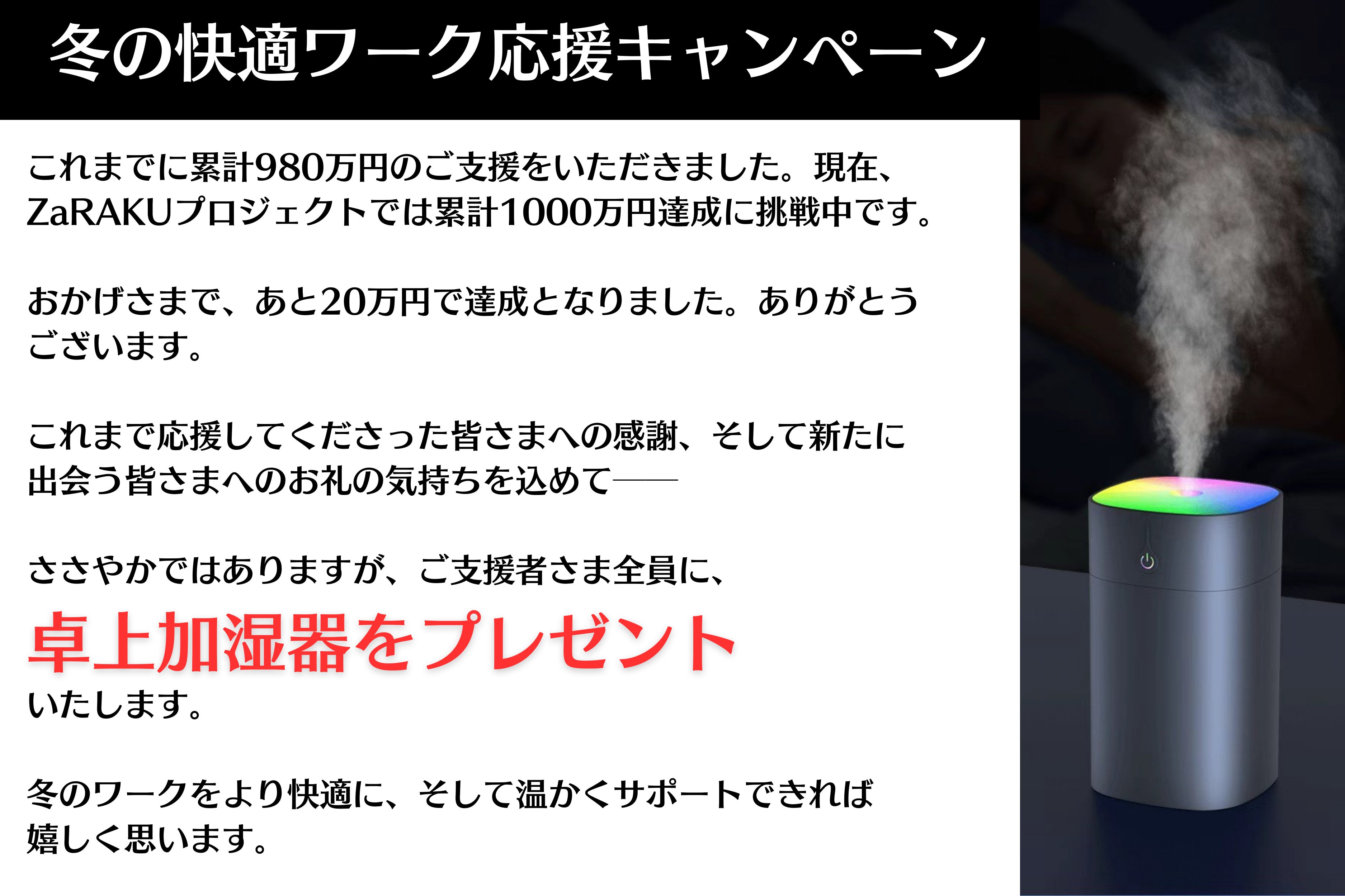 2026/02/27 20:00ようやく暖かさを感じる気候になってきましたね新生活がスタートする方、心機一転シャキッと頑張りたい方、何かと春はワクワクする季節です!そんな春をZaRAKUと共に迎えていただきたく、第3弾の掲載が先日始まりました!……が!まだ一脚も支援購入いただけていません……第1弾、第2弾でご支援くださった皆様にも顔向けできない事態になっています……ZaRAKUは私たちが自信を持ってお勧めする製品で、スタッフはもちろん、スタッフの家族も大勢使用しています。ご支援者様からも「ランバーサポートが心地いい!」「腰痛が軽減した!」「長時間座っていても疲れない!」「座面が広くてラク!」など、嬉しい感想をたくさんいただいています。なのに……!掲載ページではZaRAKUの良さを伝えきれていないようです……意気消沈のスタッフに、ZaRAKUの使用感や、ご使用状況などメッセージでいただけないでしょうか?それらを元に、どうすればZaRAKUをもっと広めて行けるかをスタッフ一同真剣に考えます!どうぞご協力よろしくお願いいたします! もっと見る