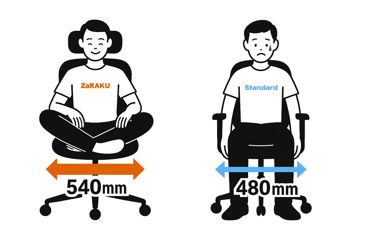 A:はい。座面幅が540mmと広めで、座面の縁に立ち上がりもないため、楽にあぐらや正座が可能です。また、アームレストが跳ね上げ式になっているため、足を自由に組めるスペースが生まれます。多くの場合、アームレストが脚に干渉して不快になります。ZaRAKUのようにアームを一時的に跳ね上げられる構造が必須です。