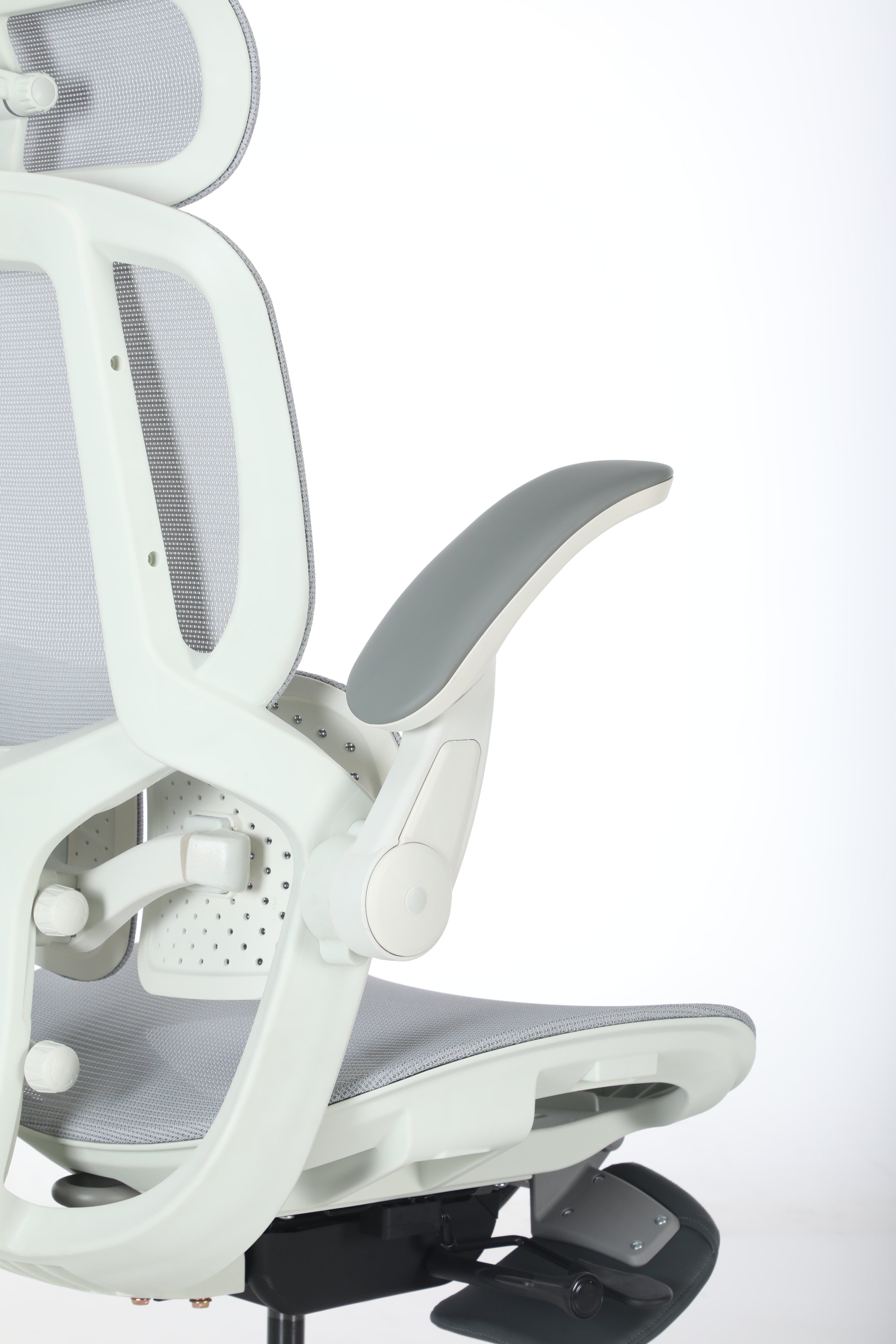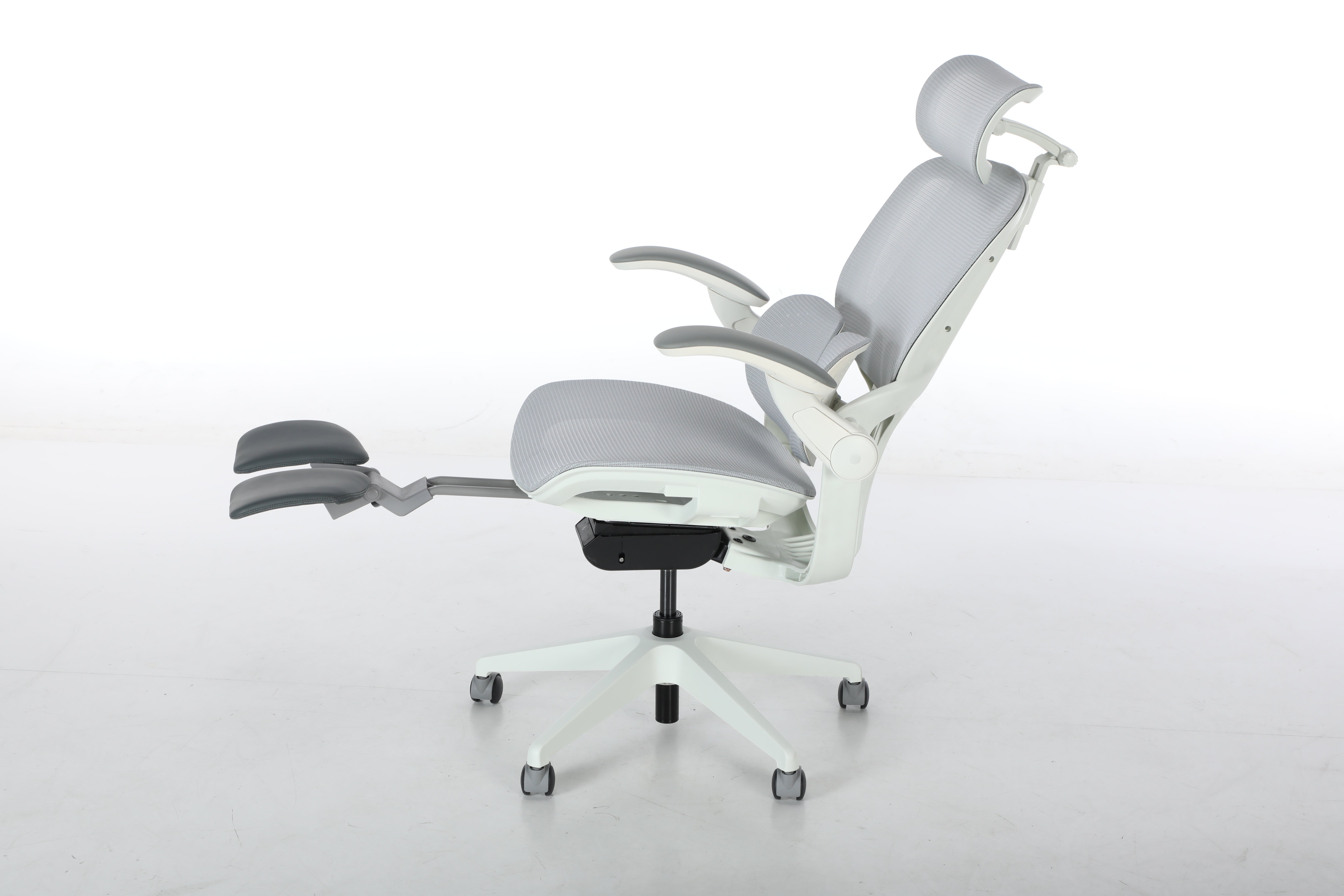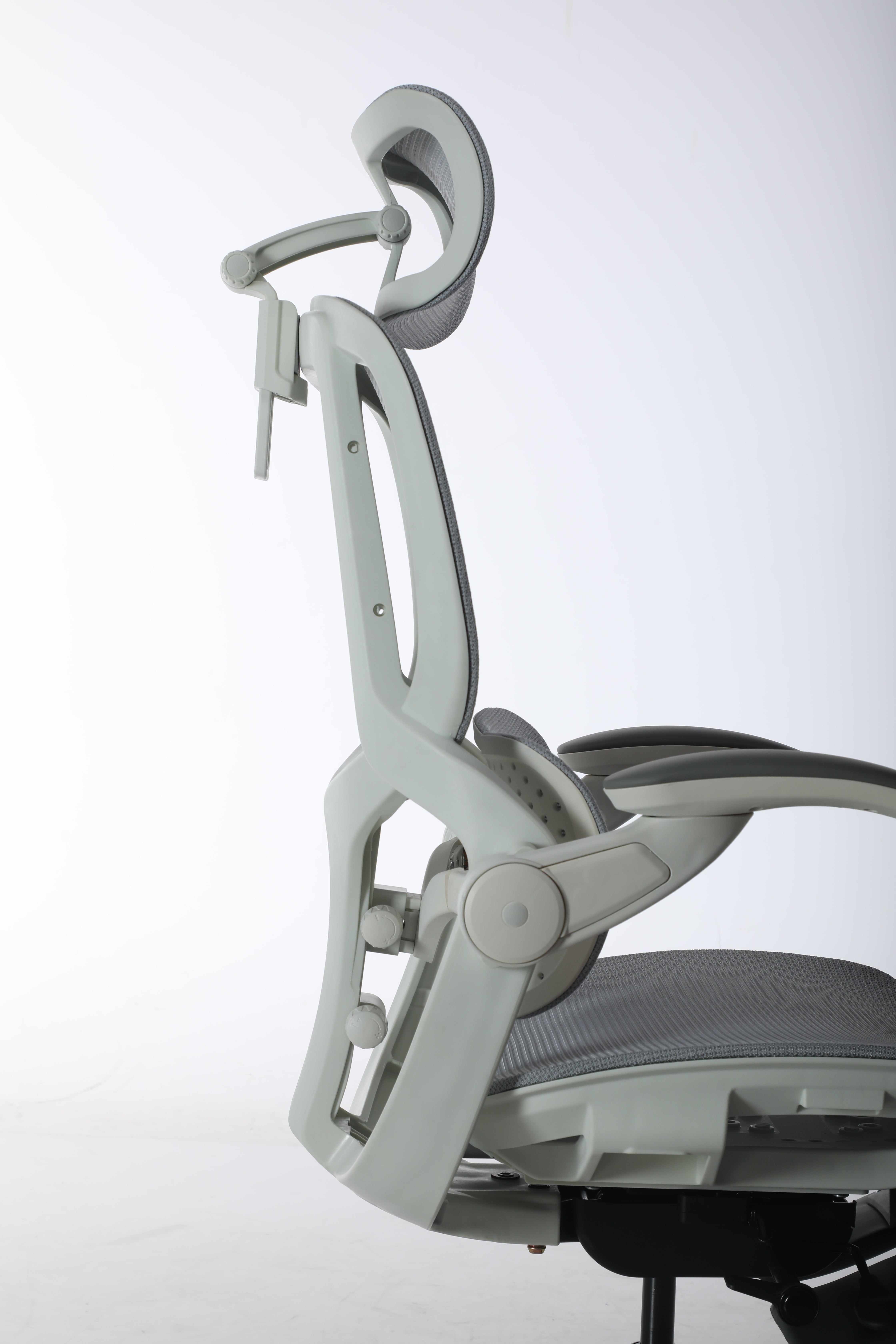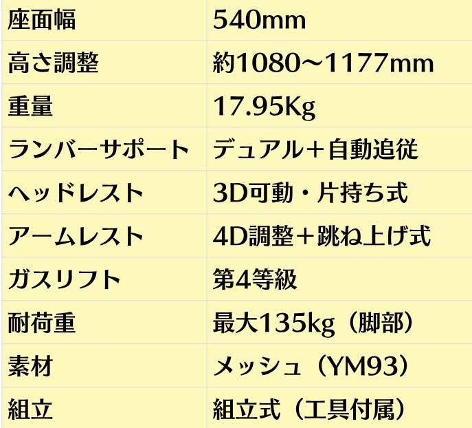 A:座面・背面には通気性と耐久性に優れたYM93メッシュを使用。4等級ガスシリンダーや高耐圧ナイロン脚で、135㎏の耐荷重で、長期間の使用にも耐えます。