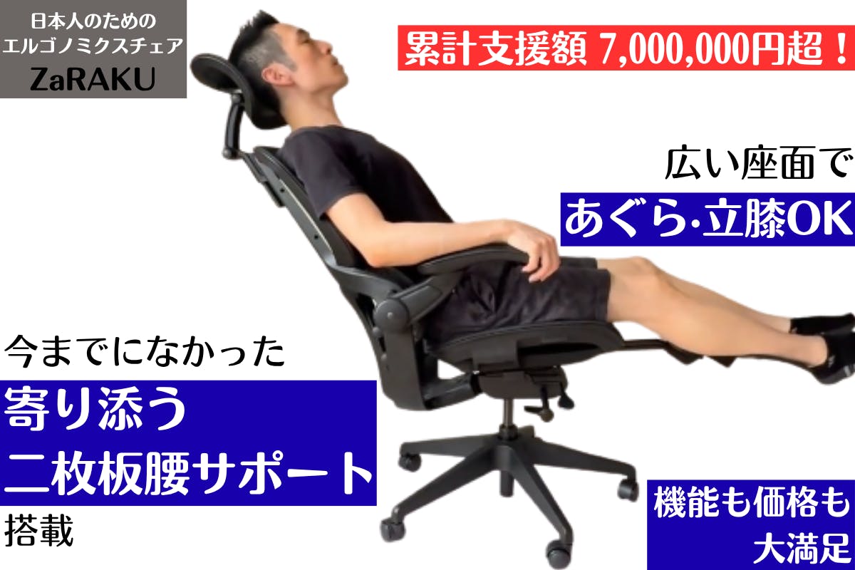 こんばんは!日本人のためのエルゴノミクスチェアZaRAKUが累計支援額700万円を突破しました!ありがとうございます!ご使用者様や使用しているスタッフからも、長時間座っていられる、腰や背中の痛みが和らいだ、などの感想がてんこ盛りです。ちなみに私は、フットレストとリクライニングを使った「ちょい寝」がお気に入りです。スッキリ起きられて、ばっちりリフレッシュできます。オトクなリターンはどんどんなくなっていきますので、支援購入をご検討の皆様は、是非お早めにどうぞ!