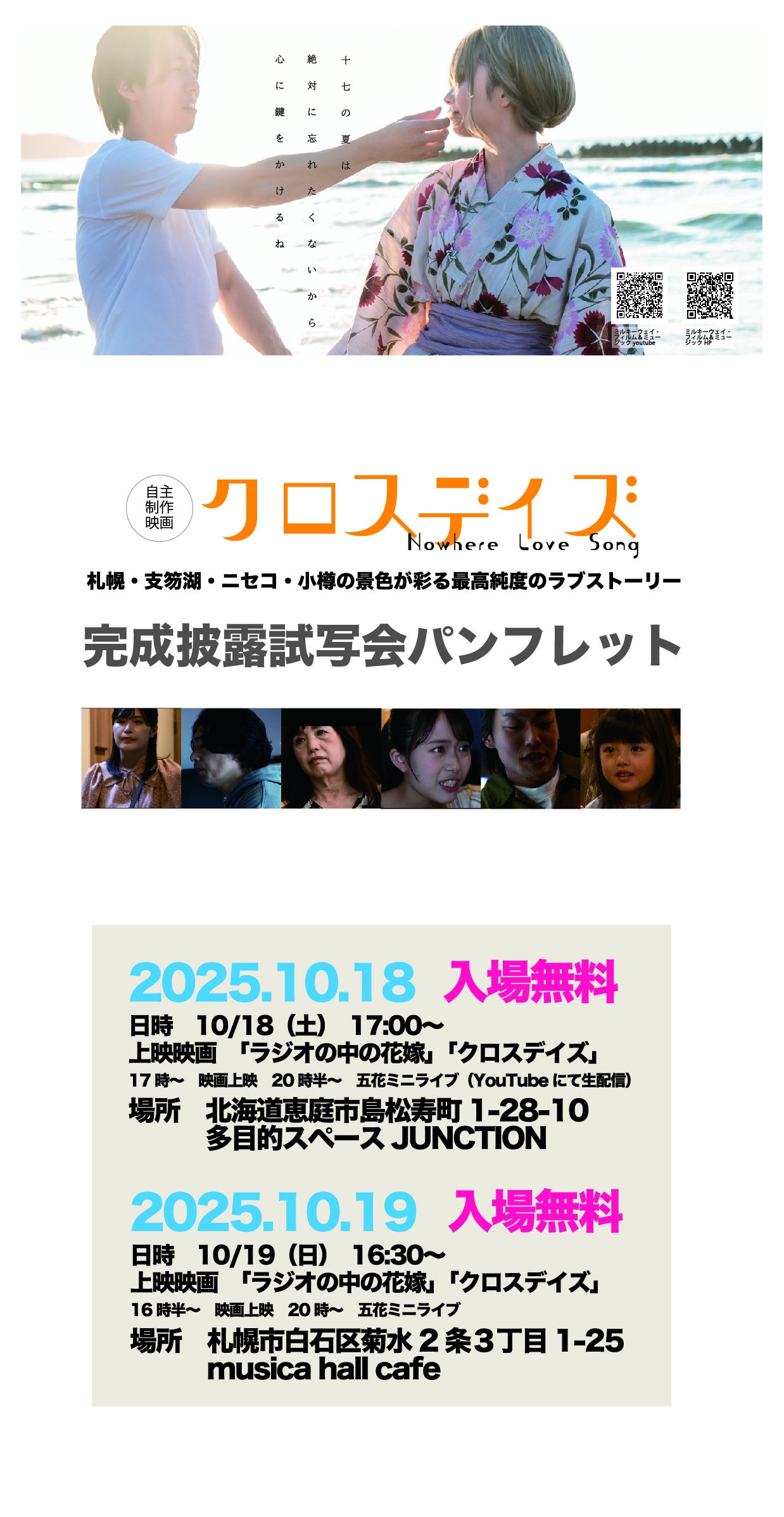 二作品ともすでに完成しており、2025年10月には北海道の札幌市と恵庭市で関係者を集めての試写会を実施いたします。上映映画「ラジオの中の花嫁」(80分)「クロスデイズ」(70分)・クロスデイズ出演キャストと監督のご挨拶・クロスデイズの主題歌を作ってくれました「五花」さんのミニライブを予定しています。