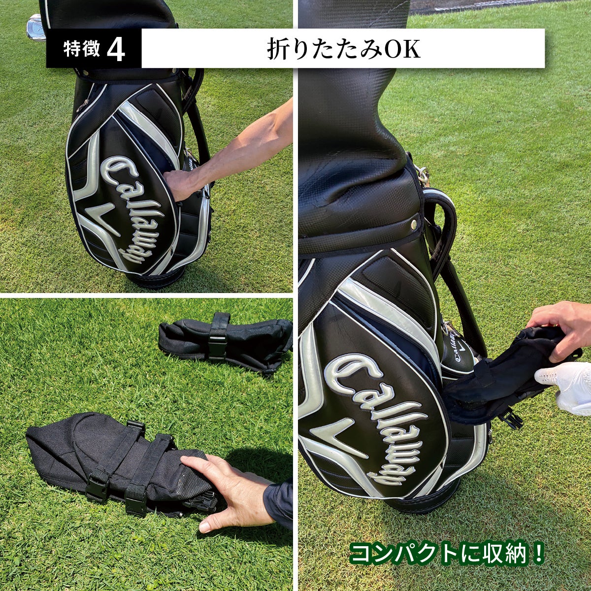 取っ手はワンタッチ着脱のバックル仕様で、外に掛けても落ちにくく、出し入れもスムーズ。使い方の幅が広がります。キャディバッグにスッキリ収納出来て邪魔にもなりません!