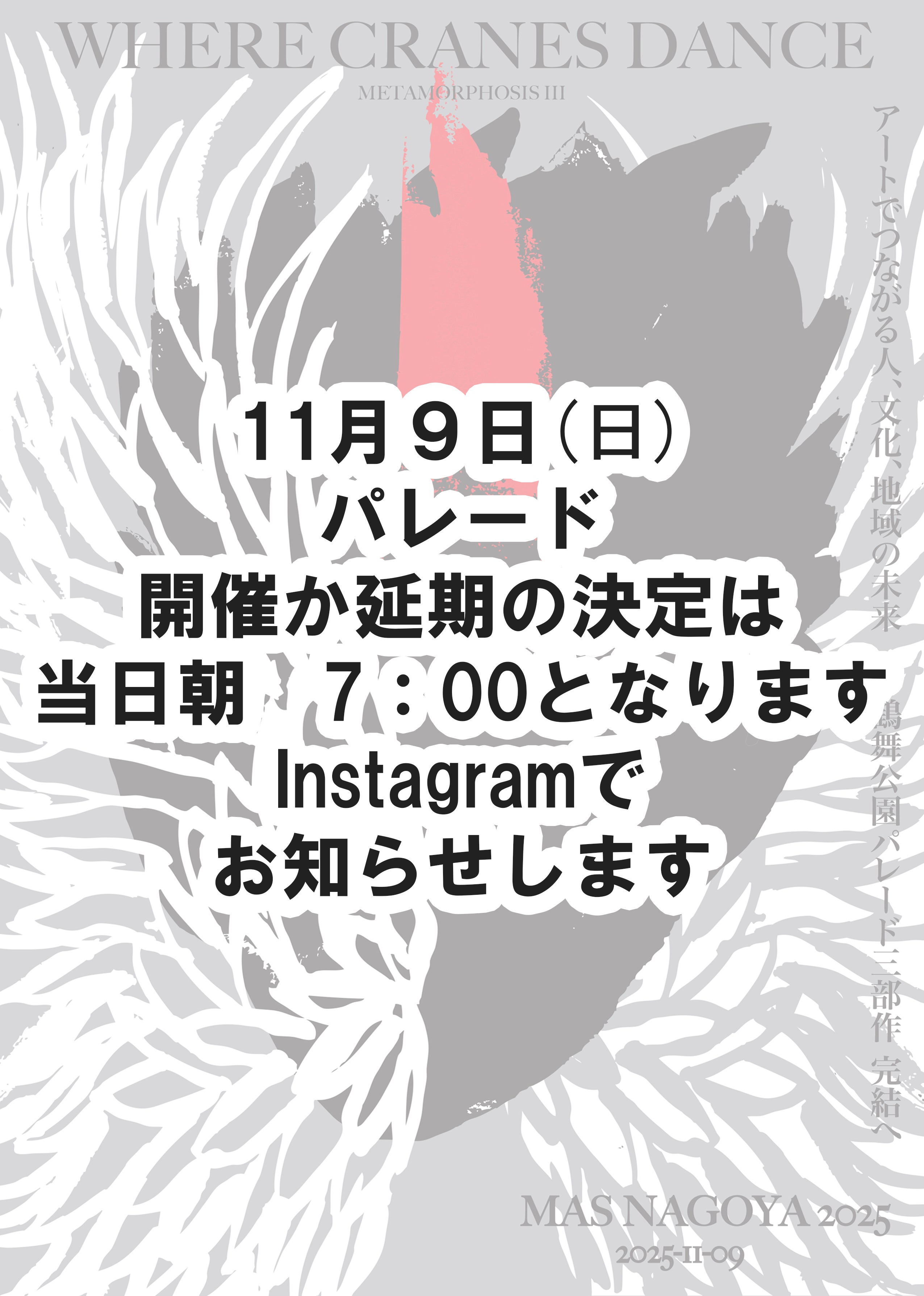 2025年11月16日、MAS NAGOYA鶴舞公園パレード「METAMORPHOSISⅢ」、完結編となる「WHERE CRANES DANCE」、無事に終了いたしました。(9(日)予定でしたが、雨天のため翌週16(日)に順延しての開催となりました。)延期となったため、参加者の減少が心配されましたが、再度の募集で100人近くの方がご参加してくださり、パレードを行うことができました。秋の公園を太鼓の音とともに歩きました。鶴のコスチュームを付けて、楽しそうな子どもたち。トリニダード・トバゴ出身の現代美術アーティストが、地域の物語をパレードで表現し、自らが今、この場所にいる意味を再確認するプロジェクト。このプロジェクトはマーロン・グリフィスのプロジェクトとは言われますが、私は自分のみのプロジェクトだとは思っていません。皆さんと作り上げた、皆さんのプロジェクトでもあります。鶴舞の物語を紡ぐため、参加してくださったお一人、お一人、クラウドファンディングを通じて、ご支援くださったお一人お一人、また協力・協賛いただいた企業、施設の皆様お一人お一人に、心から感謝いたします。本当にありがとうございました。