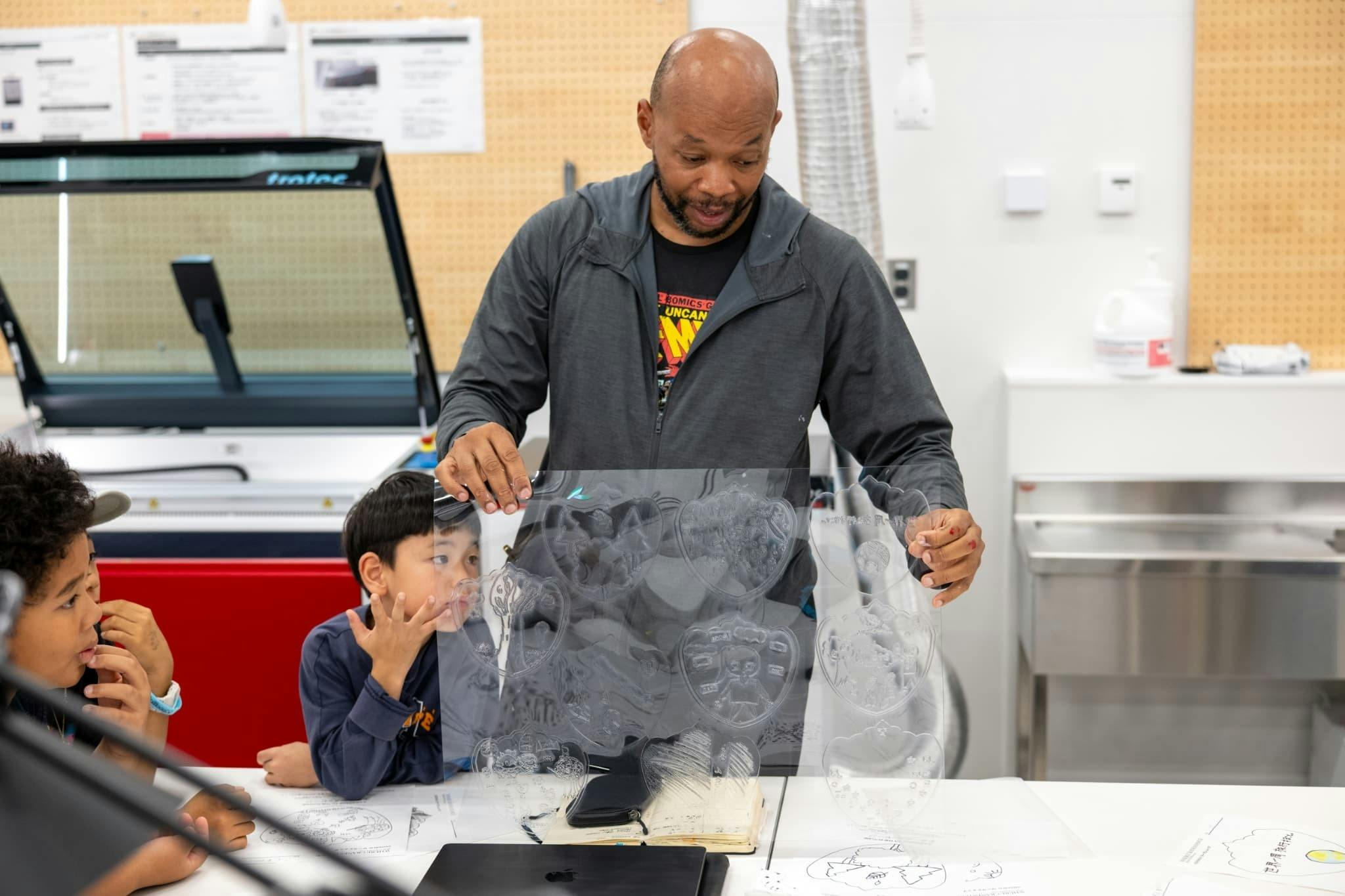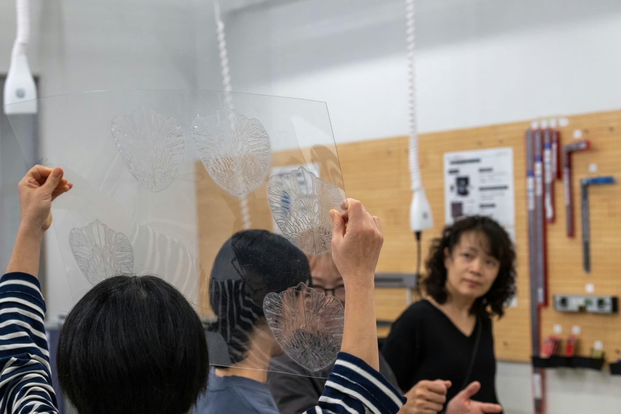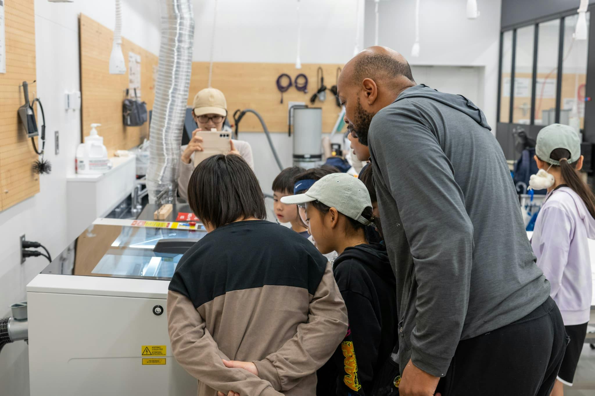 マーロンは「機械を使えば、一瞬で終わると思われがちだけど、素材に応じて強度を変えたり、細かい修正を繰り返して、作品は完成します。作品制作には忍耐力も必要だよ」と子どもたちに説明していました。