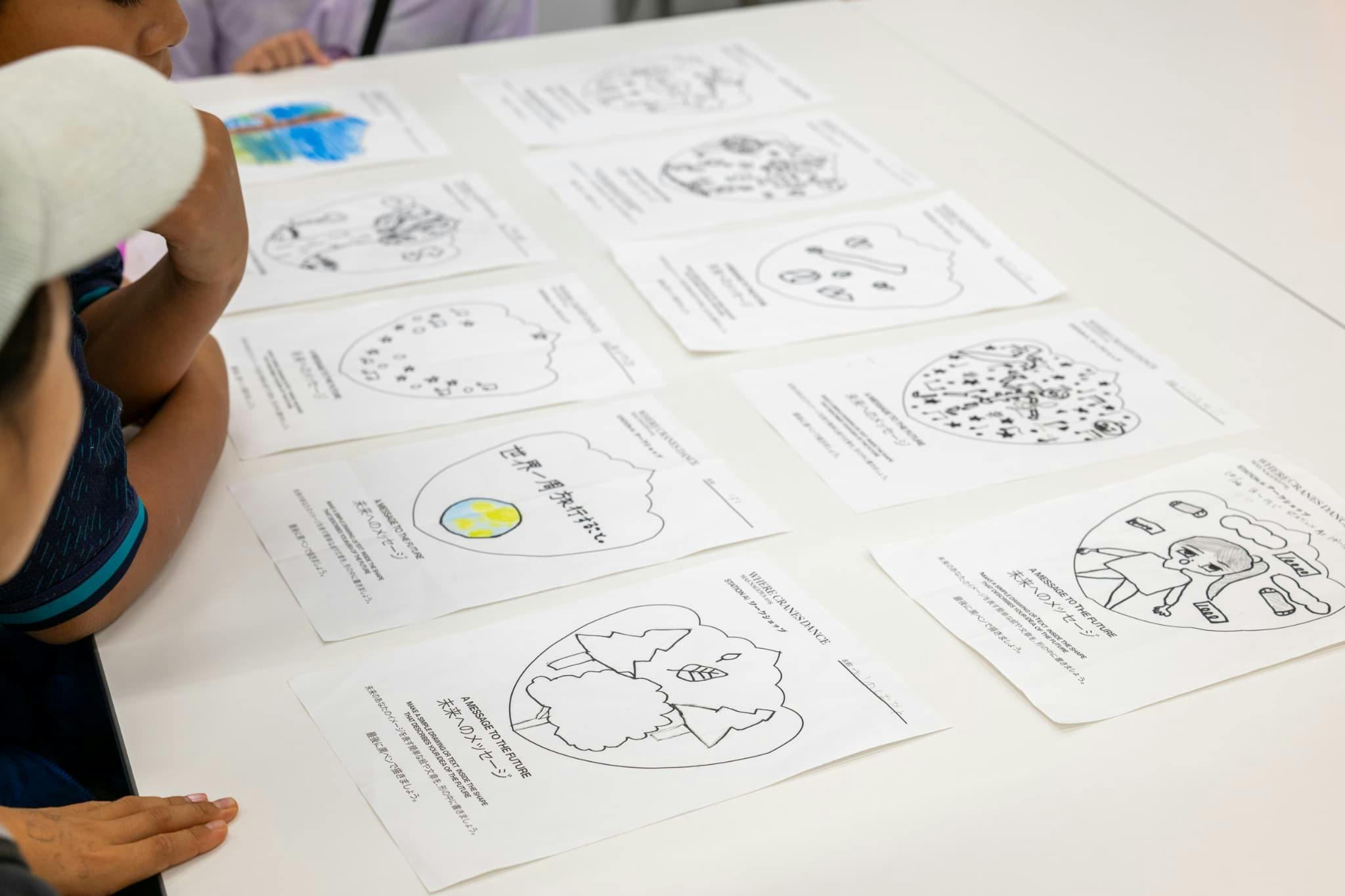 ワークショップ前に、事前に子どもたちには、今回のパレードテーマである「鶴舞の未来」に関連し、「未来へのメッセージ」の下絵を描いておいてもらいました。
