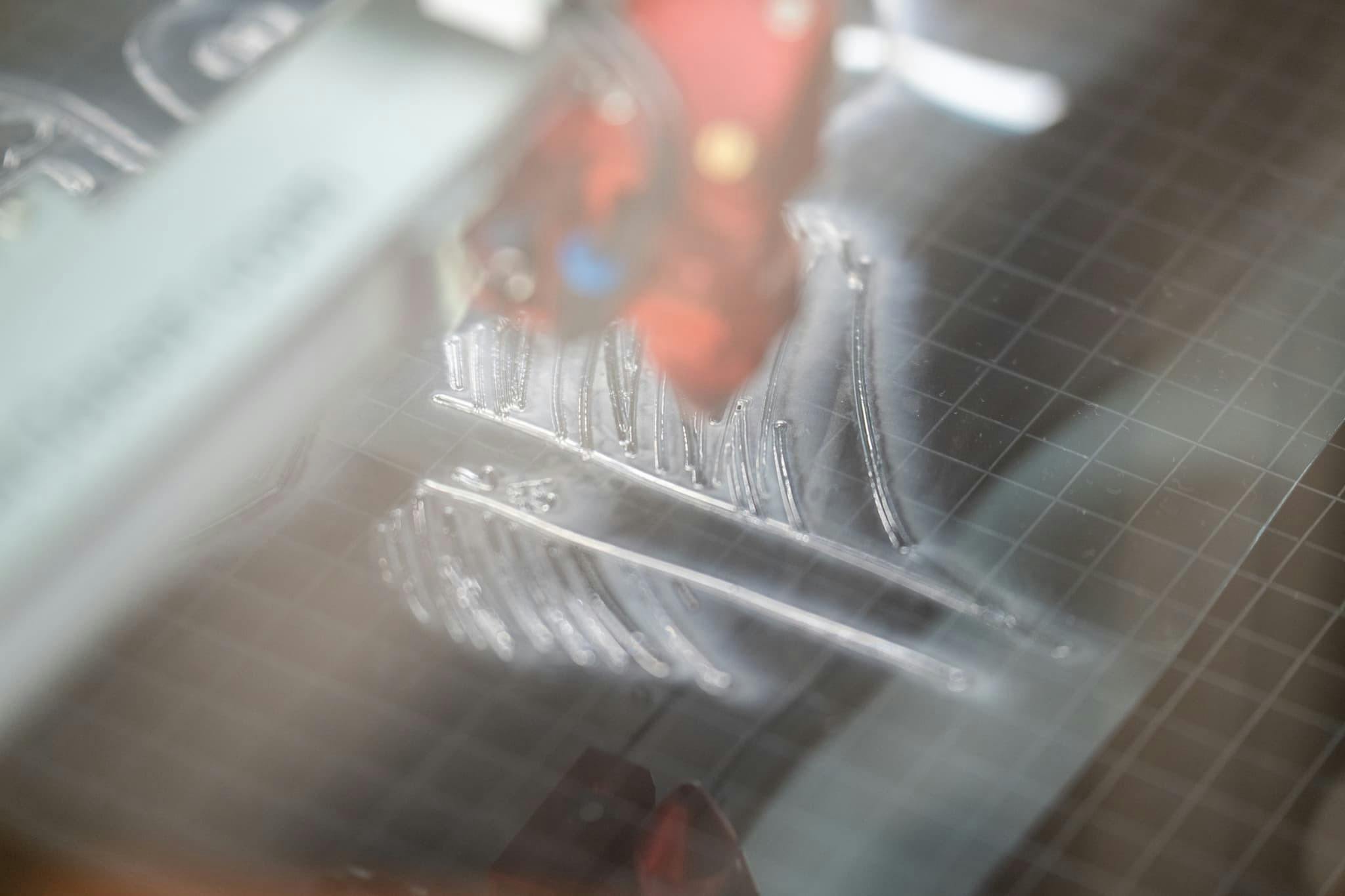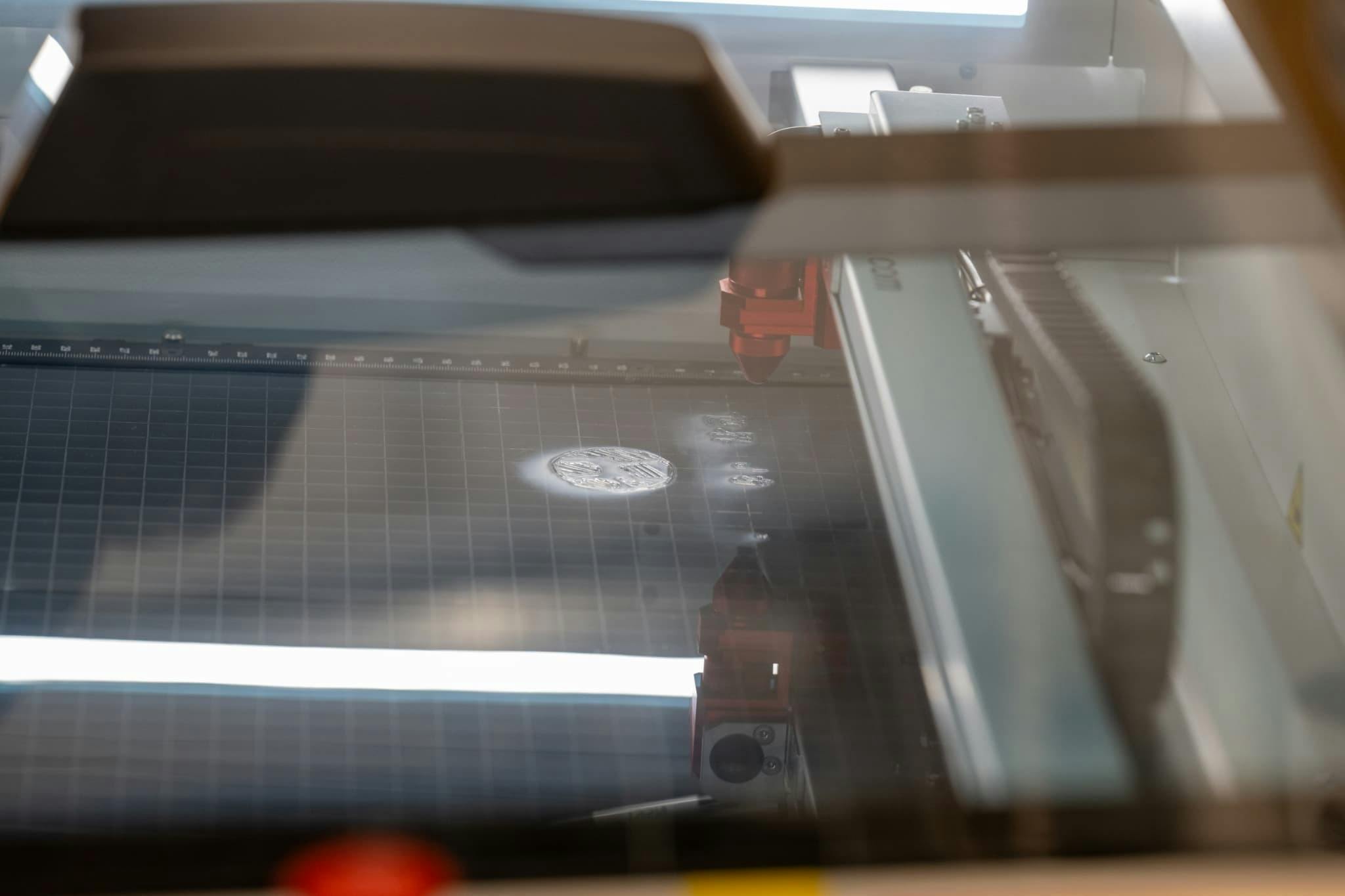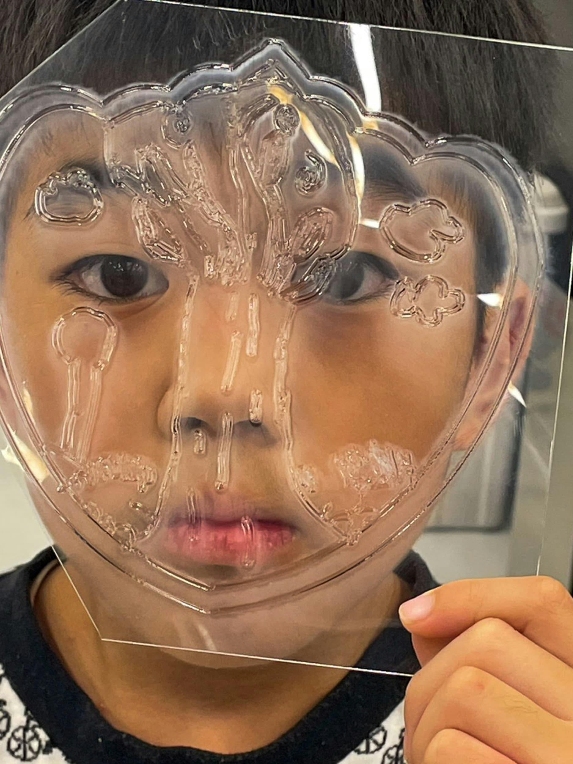 子どもたちの下絵を元に、レーザー加工機がプラスチックシートに生み出した作品が完成しました。