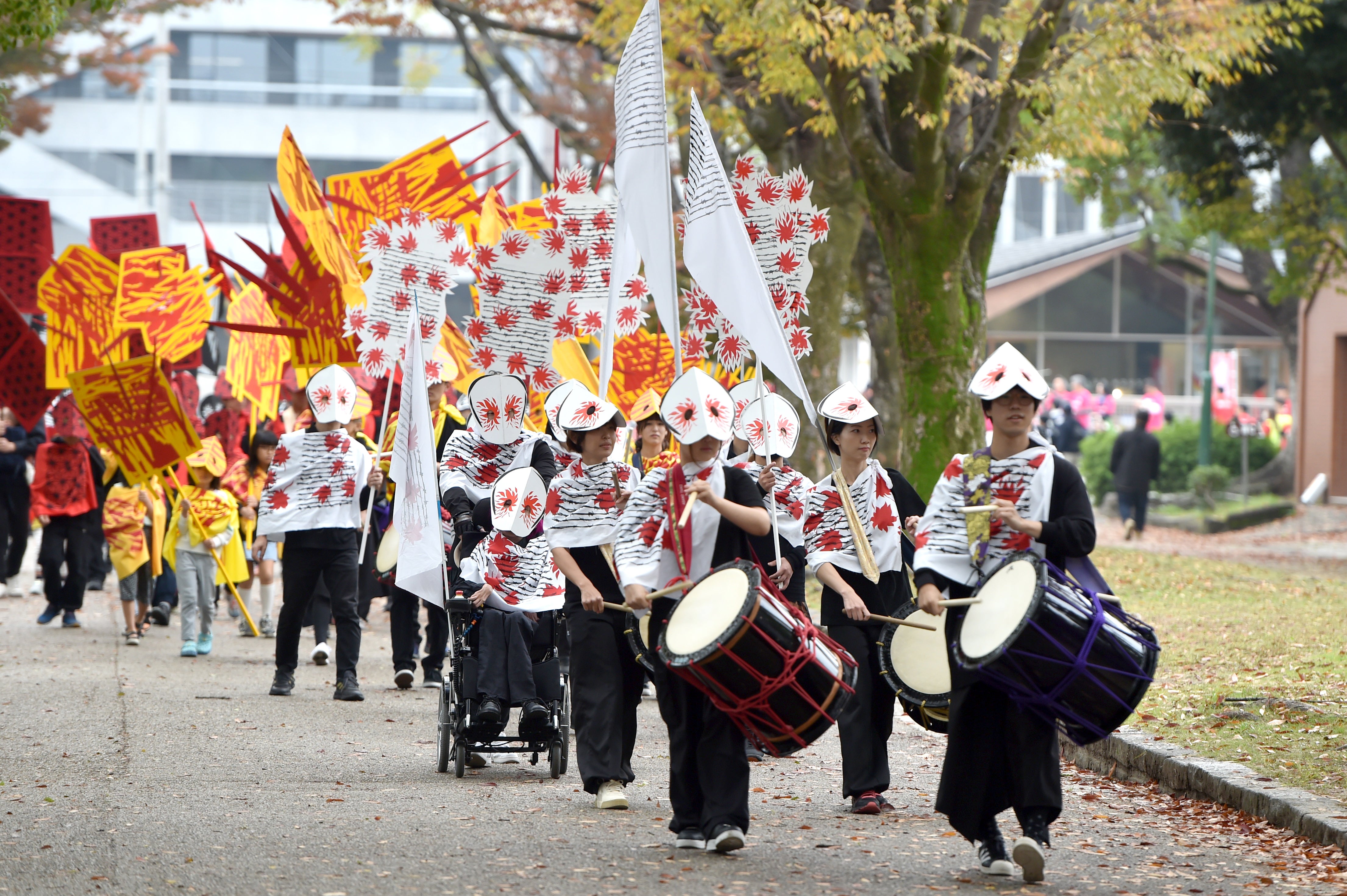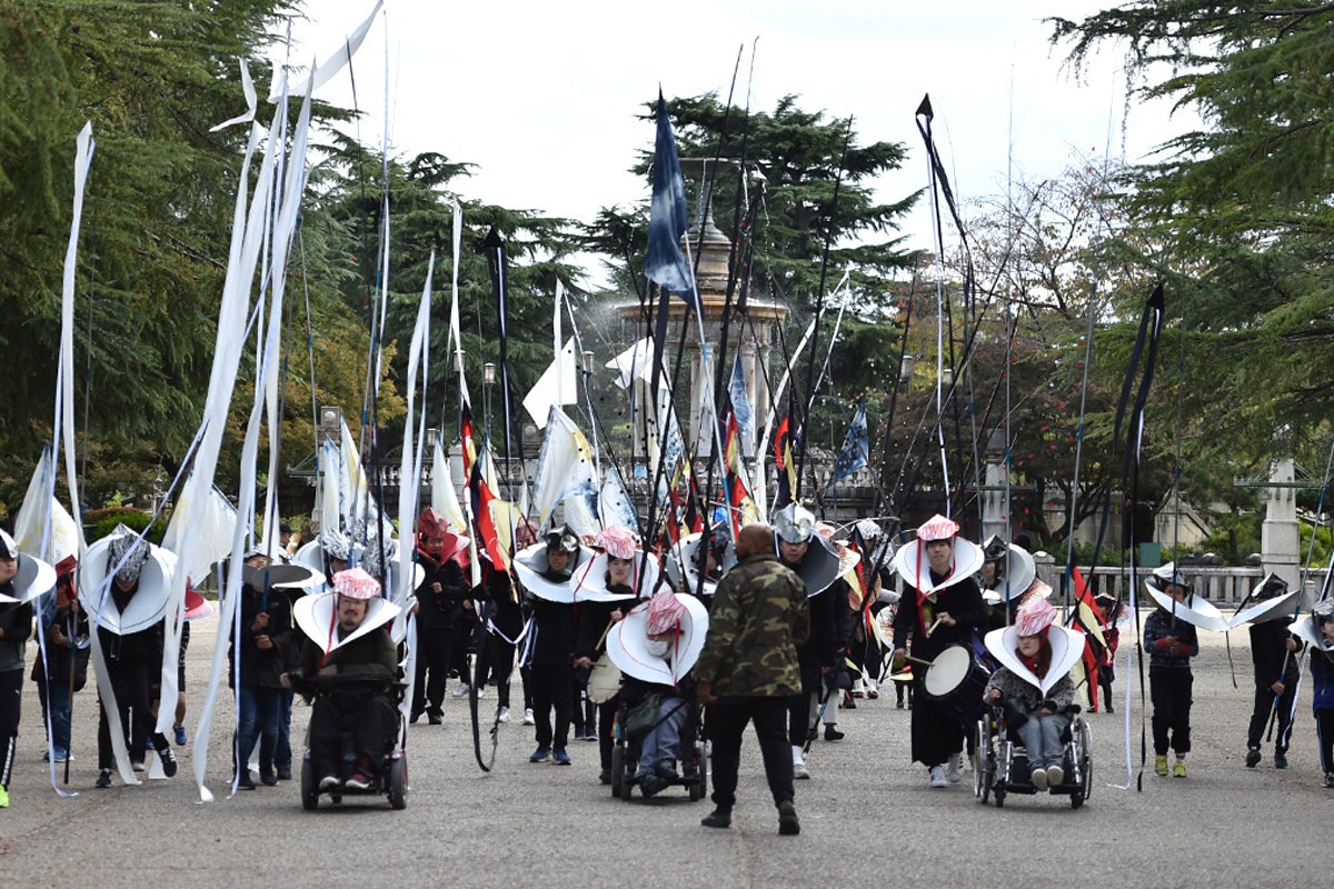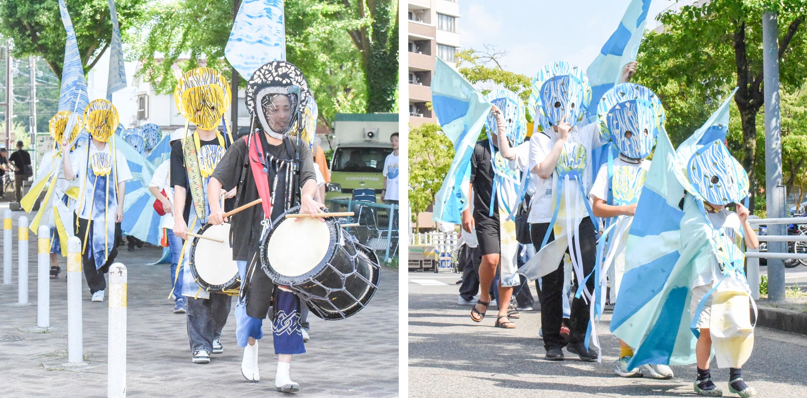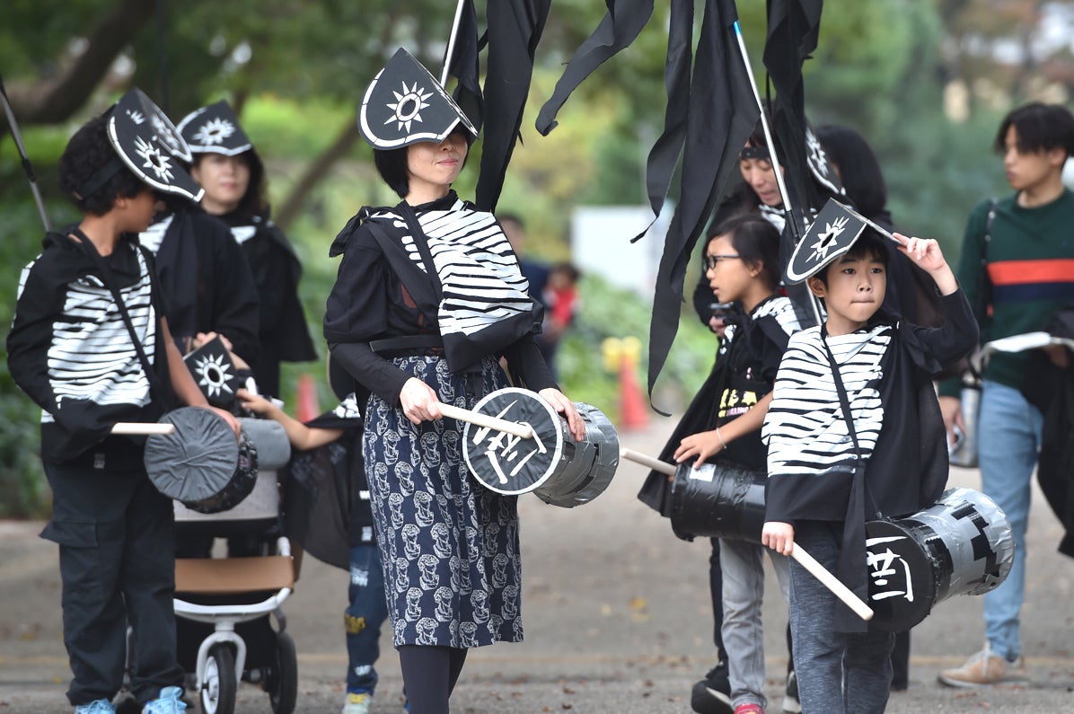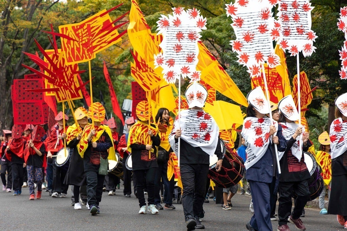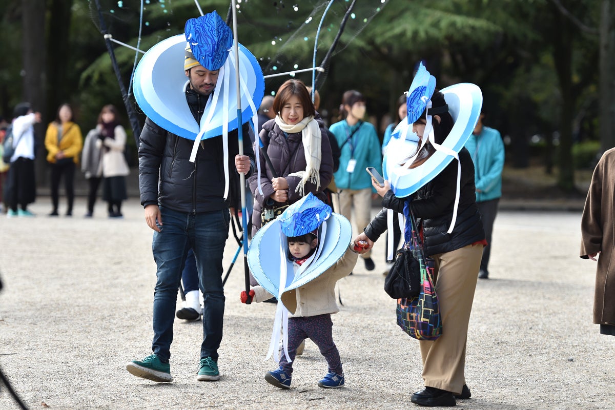 水をテーマに衣装やマスクを作り、パレード作品「METAMORPHOSIS Ⅰ WHERE WATER FLOWS(水が流れる場所)」は完成しました。2023年11月18日、集まった約70人の人たちと、鶴舞公園内を和太鼓の音とともに歩きました。