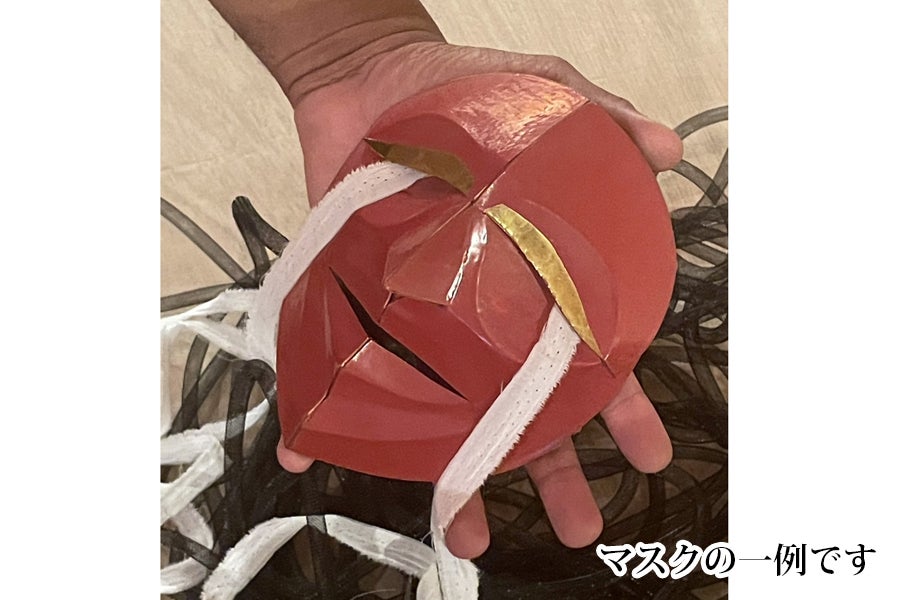 ■マーロンが作成した手のひらサイズのマスク。一点一点異なります。大きさ約17㎝のミニチュアサイズ。箱に入れてお届けします。 2025年12月末までに発送。