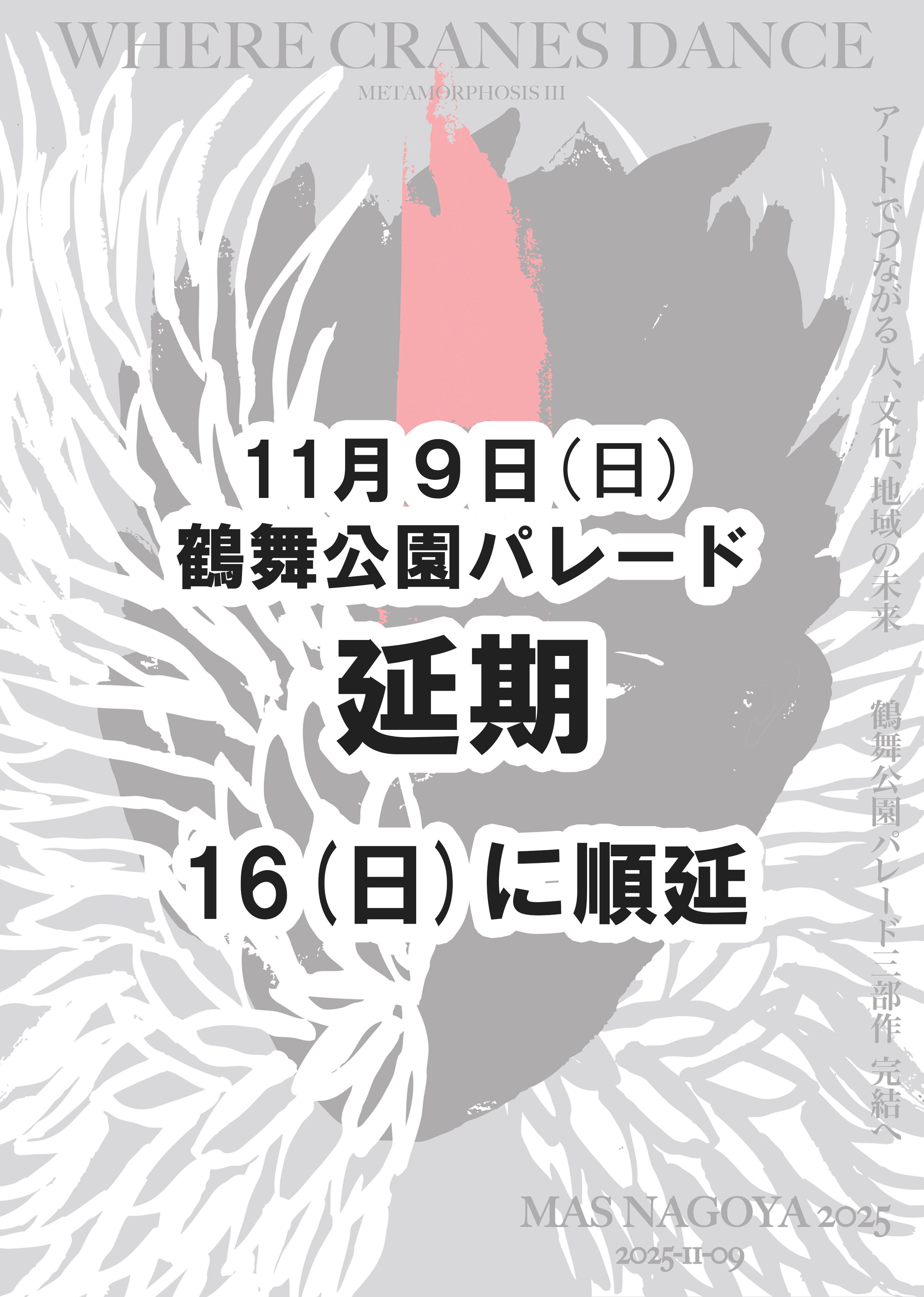2025/11/19 11:262025年11月16日、MAS NAGOYA鶴舞公園パレード「METAMORPHOSISⅢ」、完結編となる「WHERE CRANES DANCE」、無事に終了いたしました。(9(日)予定でしたが、雨天のため翌週16(日)に順延しての開催となりました。)延期となったため、参加者の減少が心配されましたが、再度の募集で100人近くの方がご参加してくださり、パレードを行うことができました。秋の公園を太鼓の音とともに歩きました。鶴のコスチュームを付けて、楽しそうな子どもたち。トリニダード・トバゴ出身の現代美術アーティストが、地域の物語をパレードで表現し、自らが今、この場所にいる意味を再確認するプロジェクト。このプロジェクトはマーロン・グリフィスのプロジェクトとは言われますが、私は自分のみのプロジェクトだとは思っていません。皆さんと作り上げた、皆さんのプロジェクトでもあります。鶴舞の物語を紡ぐため、参加してくださったお一人、お一人、クラウドファンディングを通じて、ご支援くださったお一人お一人、また協力・協賛いただいた企業、施設の皆様お一人お一人に、心から感謝いたします。本当にありがとうございました。 もっと見る