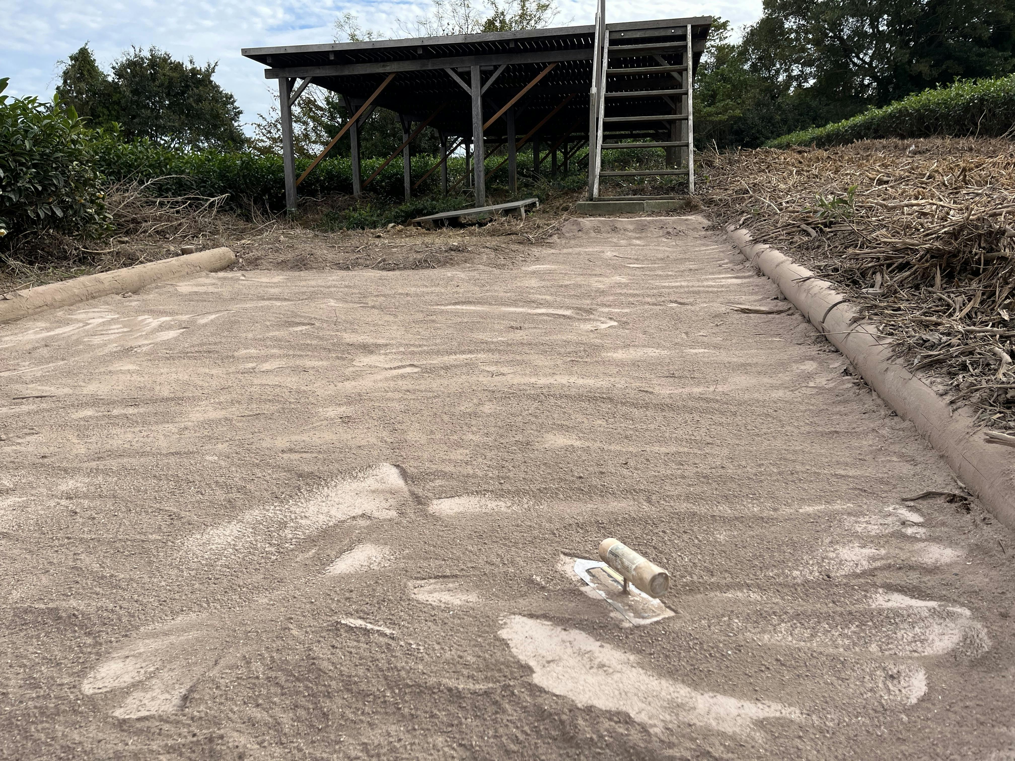 腕力で1袋ずつまいて、コテでフラットにしていく。