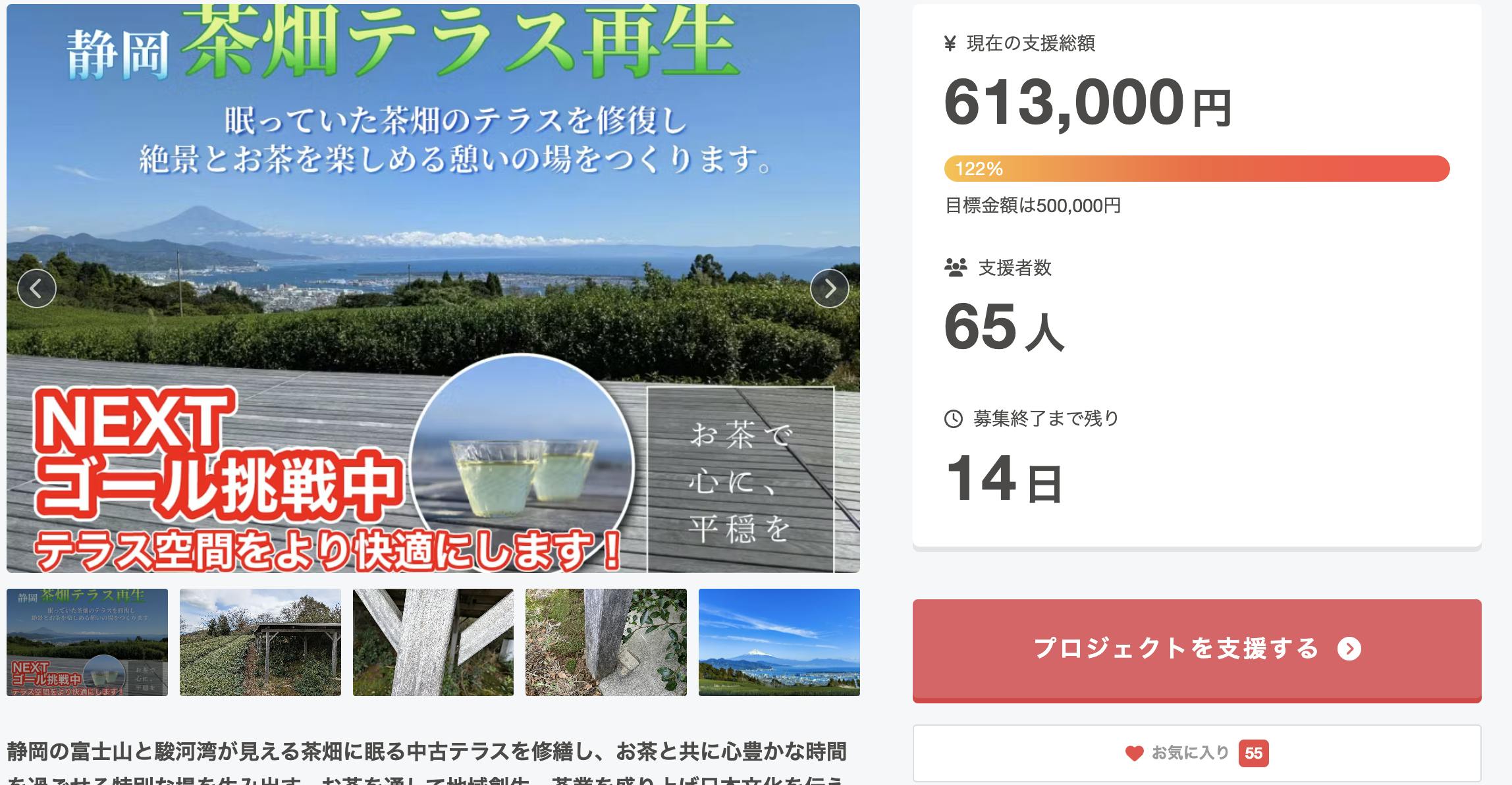 こんにちは。杉山貢大(すぎやま みつひろ)です。【茶畑テラス再生プロジェクト】 16日目 支援額 613,000円 支援者数 65人 達成率 122% ご支援ありがとうございます!!ネクストゴールの資金は茶畑の作り直しに使わせていただきます。さて、初期ファウンディングをありがたく無事に達成できました。大きな資金投入先である、お茶木の粉砕依頼と固まる砂の発注を済ませました。粉砕機導入は立ち合いが必要になり、ただいまお茶の収穫時期とも重なっているので日時は調整中ではありますが、近日中にご報告します。固まる砂ですが、15kg入りを207袋をネットにて発注。なかなか大きな数量なのか、お届け日が1ヶ月先の11月になるとのこと。施工が思ったより遅くなってしまいそうです。しかしその頃には収穫もひと段落できています。届き次第、着手して速攻で終わらせますので、こちらのご報告をお待ちください。テラスをてに入れた時は、ぼちぼちゆっくり直せられればいいか、、、、と思っていましたが、あなたのご支援のおかげでオープンも早めることができました!茶畑作りを含めるとまだまだ時間は掛かりますが、コツコツ仕上げていきます。今後も引き続きよろしくお願いします!