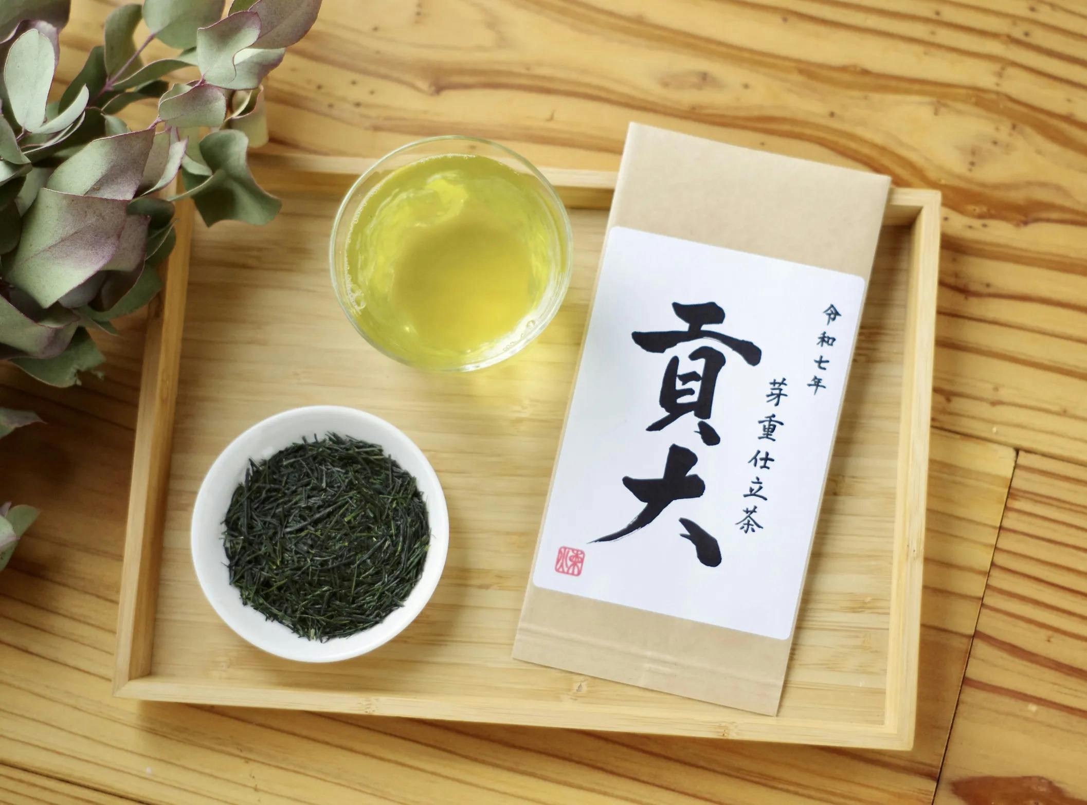 おはようございます。杉山貢大(すぎやま みつひろ)です。リターンの我が家のお茶「貢大」の紹介です。品種はさえみどり。棚設備で寒冷紗を12日間かけて色と旨みをのっけています。小さな機械で丁寧に製造しています。細よれで針のような形状に深緑の照りのある見た目で、湯をさすと新緑にもどり葉っぱに戻るので待ち時間、見ても楽しめます。濃い旨みと鼻から抜ける甘い香り、濃厚な旨みを堪能できます。今年の全国茶品評会4kgの部で、3等に入賞したお茶です。我が家でできる一番高品質なお茶なので自分の名前をつけて自信を持ってオススメできるお茶です。ご支援のリターンを選ぶ時にご一考ください。