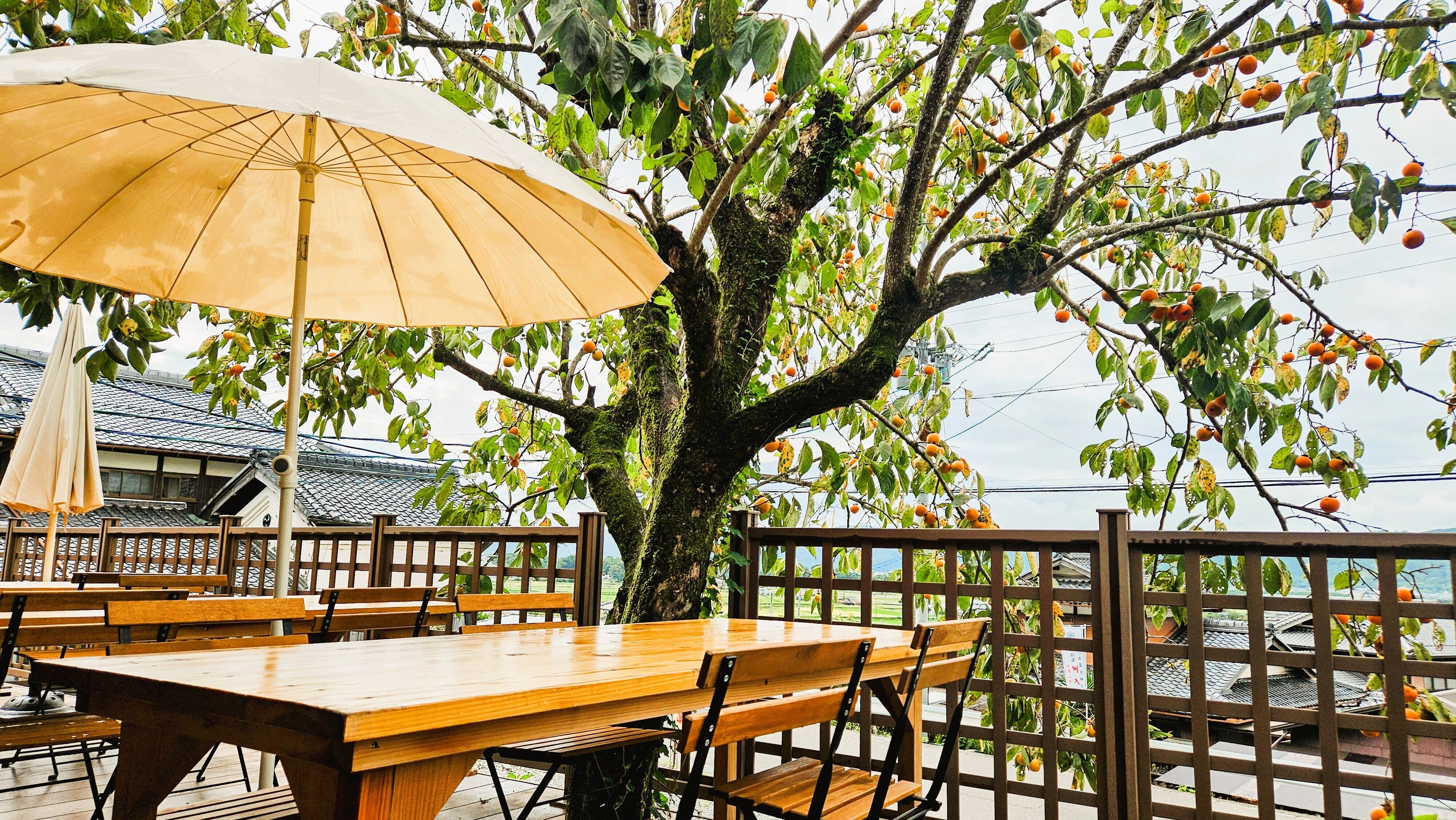 田園風景を望むテラスにはワンちゃんと一緒にくつろげる14席を設け