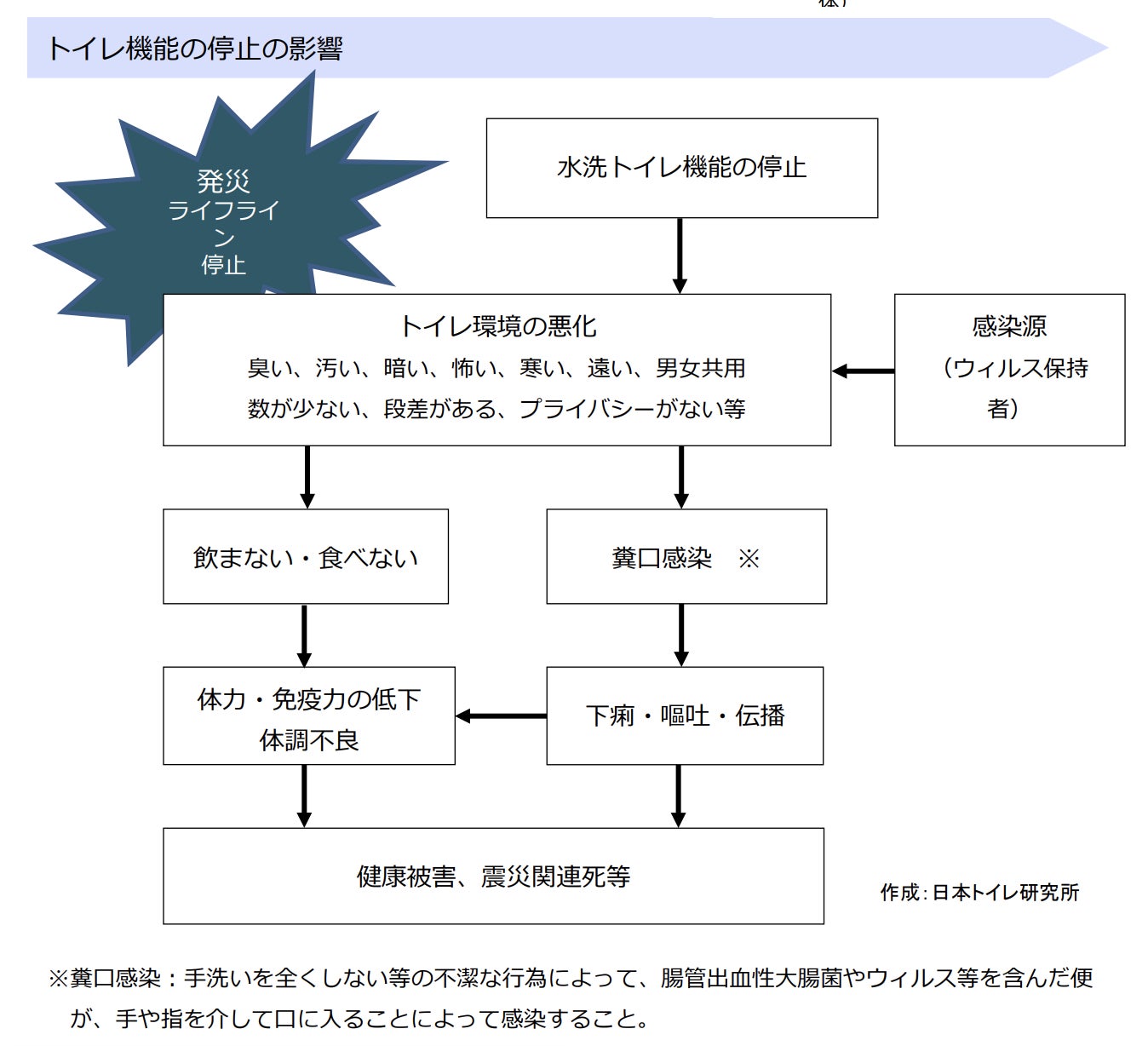 そうなると、やむを得ず野外で排泄するしかなくなり、周辺には大小便が放置され、悪臭のみならず感染症の発症リスクが発生する事態にもなります。